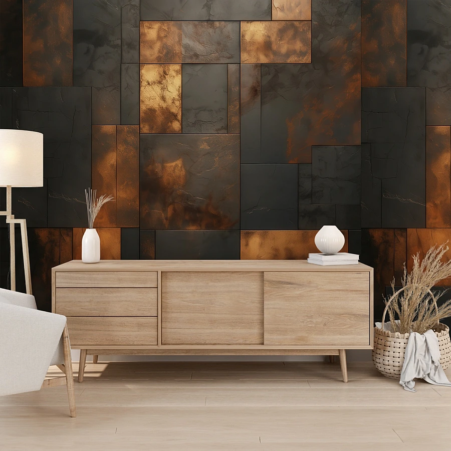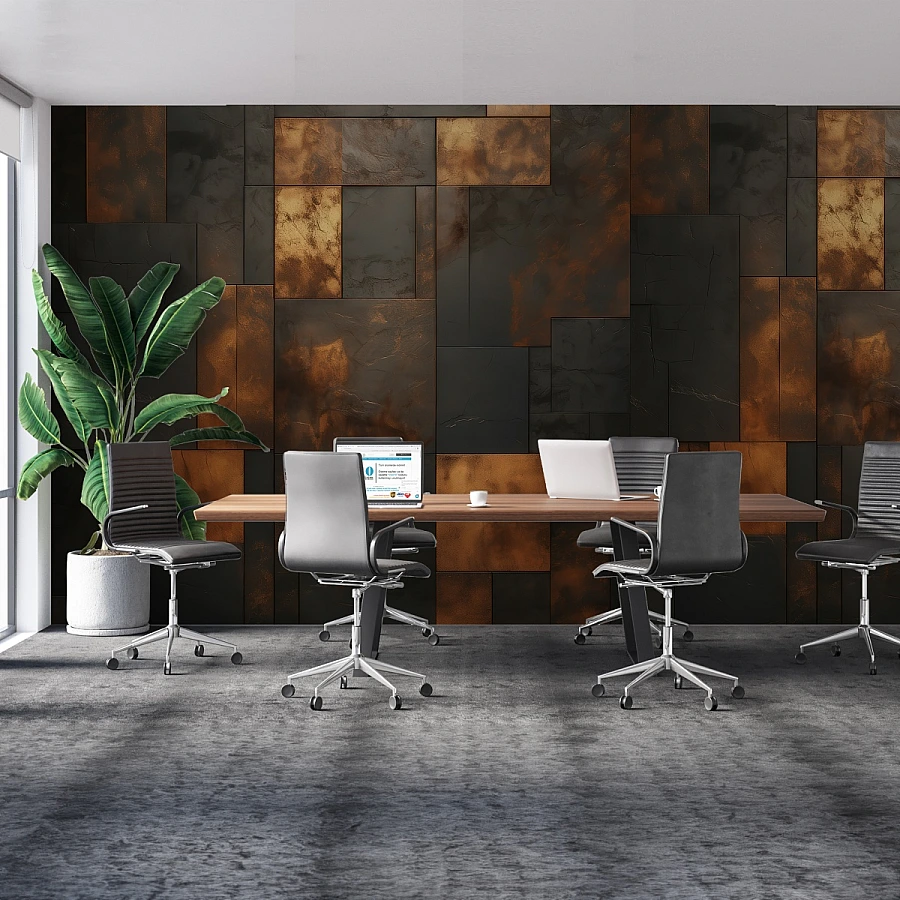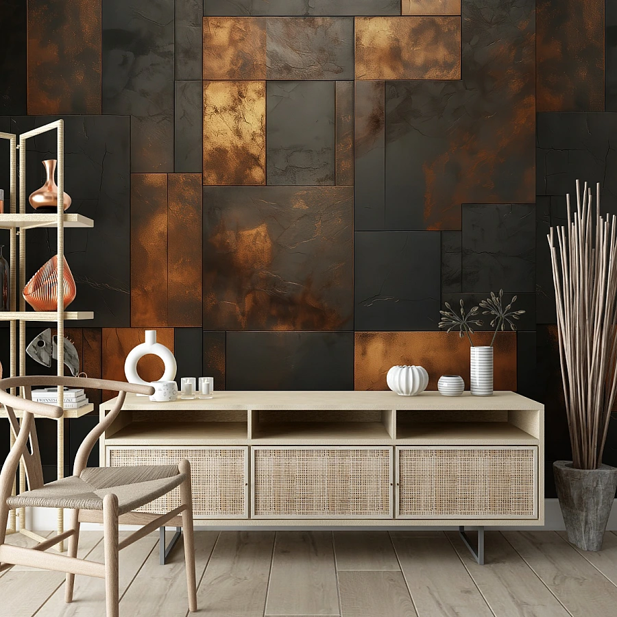 Tags: industrial wallpaper, rust wall mural, metallic texture wallpaper, geometric wall design, modern loft wallpaper, panel wall mural