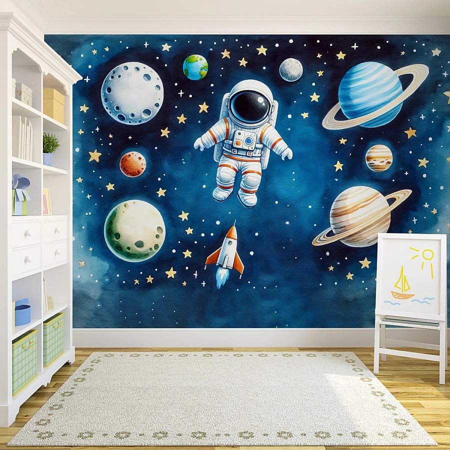 Kids Space Adventure Wall Mural – Astronaut Planets Galaxy Design