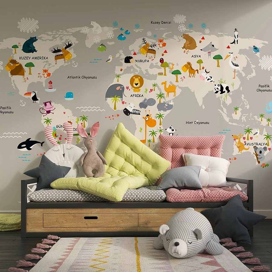 A playful world map comes to life with adorable animals in this engaging kids wall mural, turning geography into a fun and colorful experience. Each continent features charming illustrations that spark curiosity and imagination.