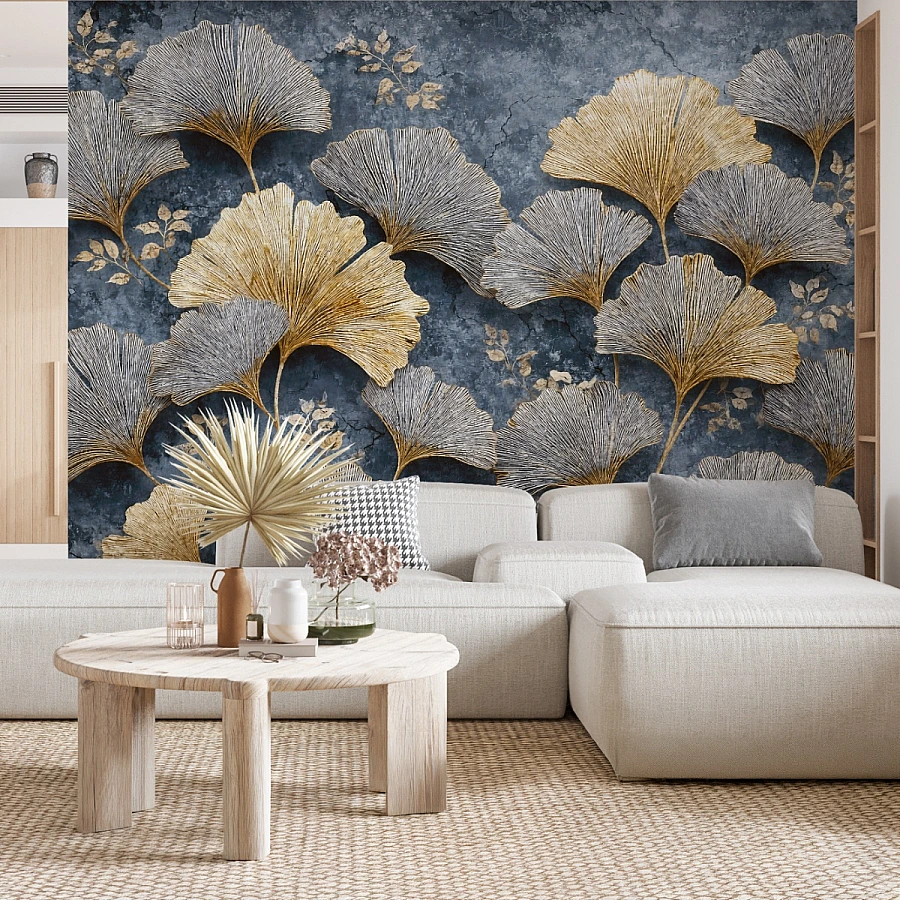 Luxury Ginkgo Leaf Wall Mural – Blue Gold Botanical Design