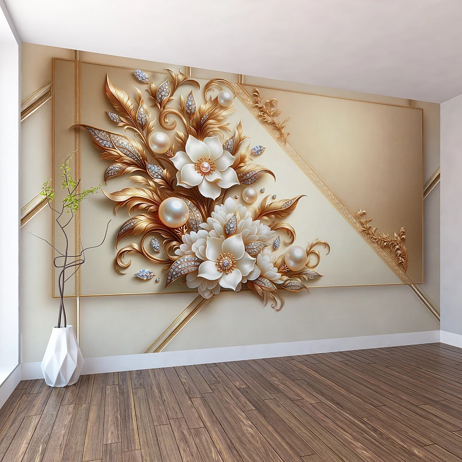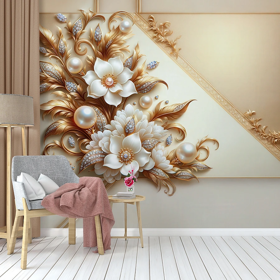 Exquisite gold leaves, delicate white blossoms, and luminous pearl accents come together in this stunning luxury floral wall mural. The layered 3D composition creates a rich sense of depth, transforming the wall into an elegant piece of art with a refined and sophisticated presence.