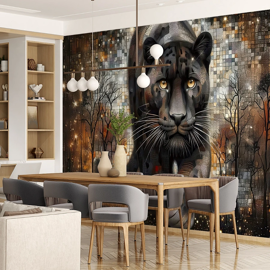 A powerful black panther emerges from a textured mosaic background in this striking wildlife wall mural. Its piercing golden eyes and detailed features create an intense focal point, blending realism with artistic depth.