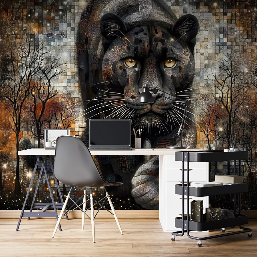 Perfect for bold interiors, this mural transforms the space into a statement of strength and elegance. It brings a sense of mystery, power, and modern artistic expression into living spaces and creative environments.