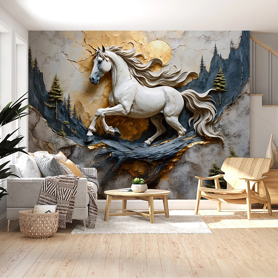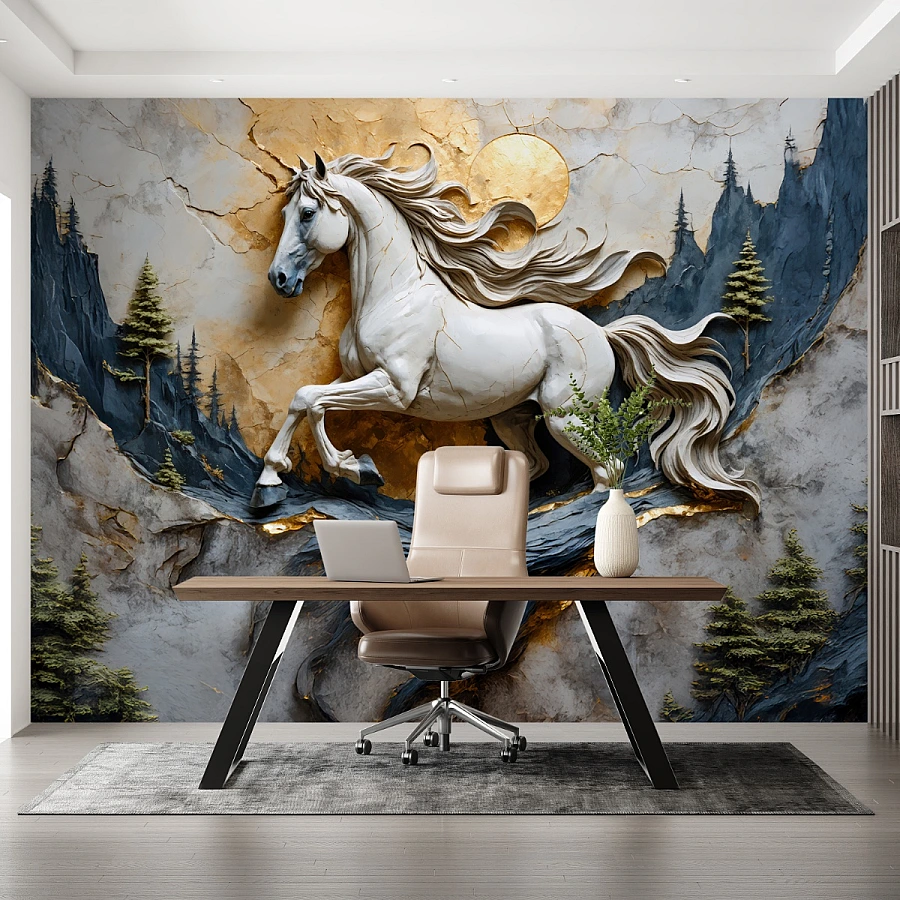 Powerful, elegant, and timeless—this white horse wall mural captures the essence of freedom and strength through a striking artistic composition. Sculpted in a marble-like texture and highlighted with golden accents, the horse emerges with dynamic movement, creating a bold focal point that commands attention.