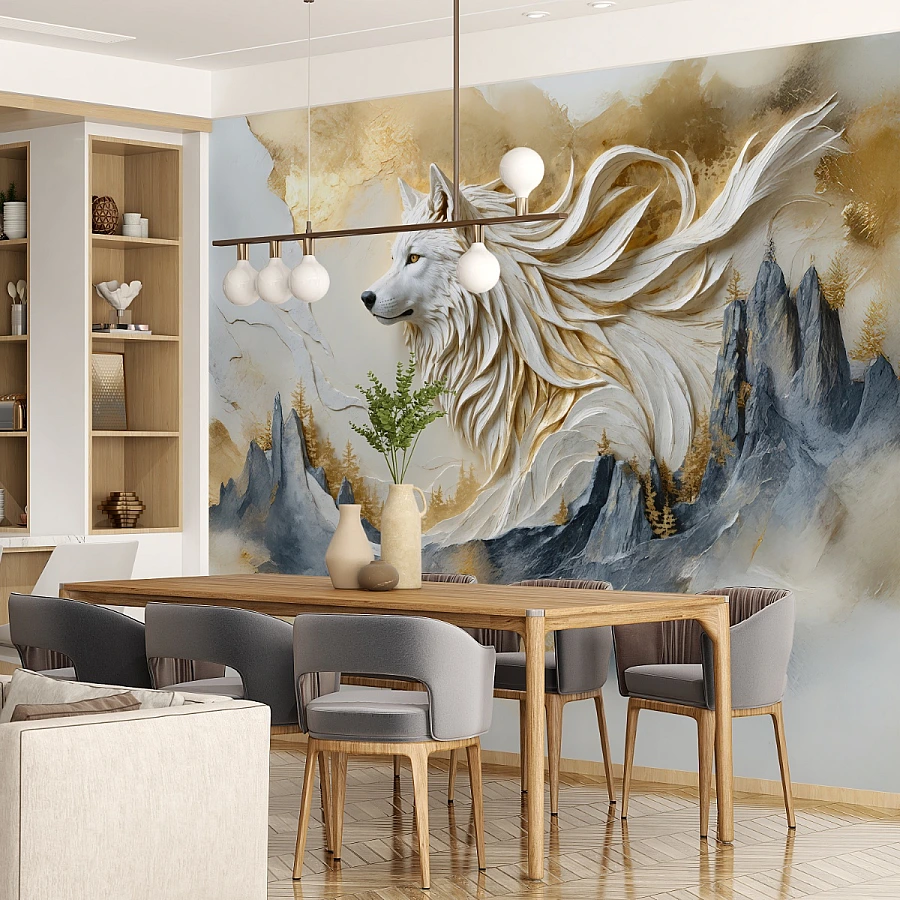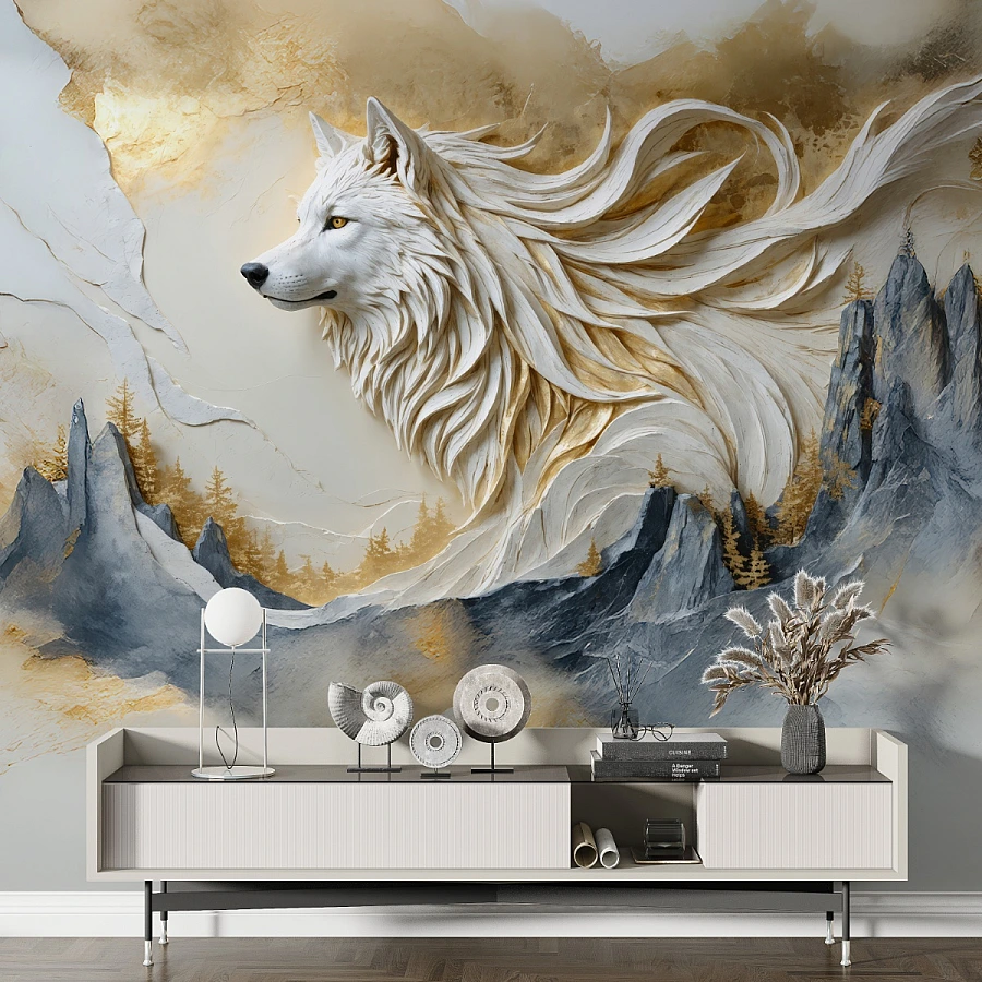 Accented with rich gold tones and cool stone hues, the design balances raw nature with refined artistry. The wolf’s intense gaze and sculptural detailing bring a commanding presence to the space, while the mountainous backdrop adds a sense of freedom and wilderness.