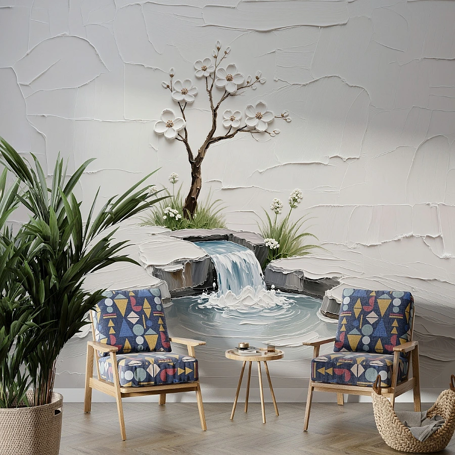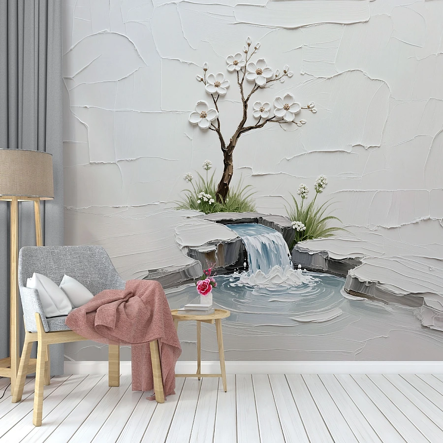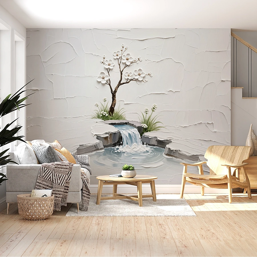 Tags: zen wall mural, waterfall wallpaper, minimalist wall art, 3d textured mural, blossom tree wallpaper, spa decor wall, neutral wall design