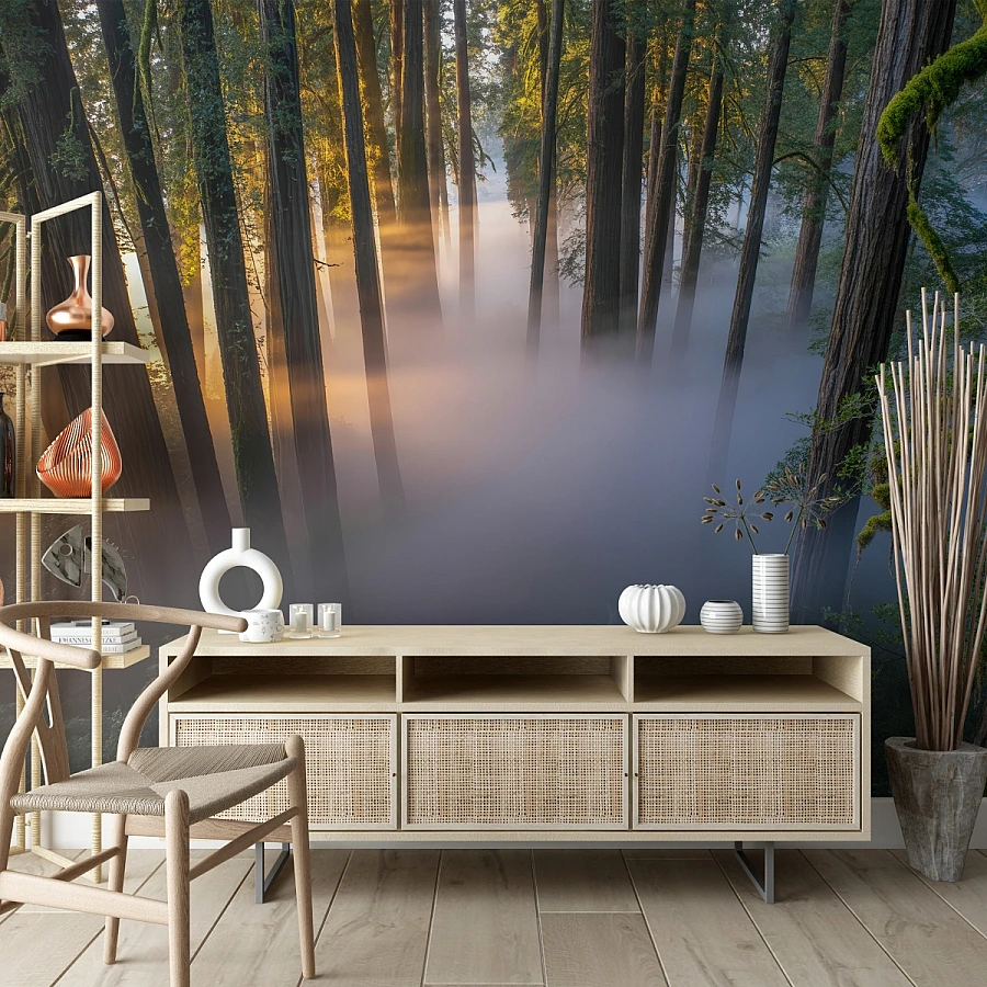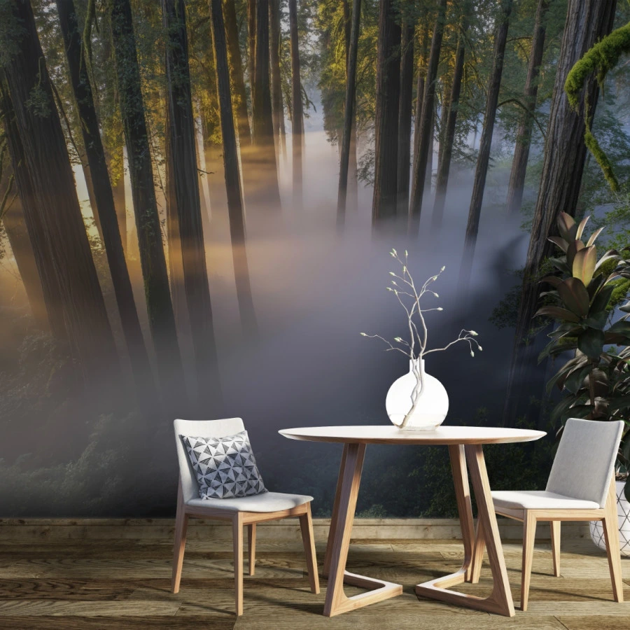 Tall forest trees rise through soft morning mist in this atmospheric misty forest wall mural. Gentle sunlight filtering between the trunks creates a calm and immersive woodland scene, bringing natural depth and quiet beauty to the wall.