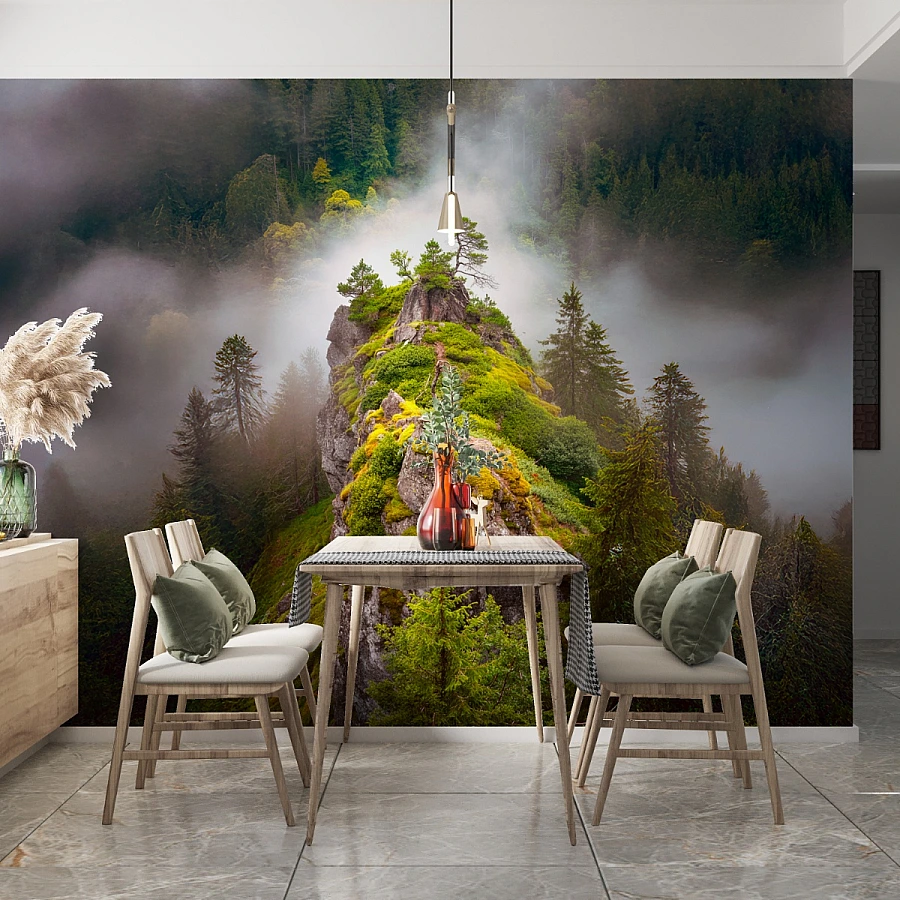 A dramatic rocky cliff rises through soft mist in this captivating mountain wall mural. Covered in vibrant moss and greenery, the natural formation creates a powerful yet calming focal point, bringing raw nature and depth directly into the space.