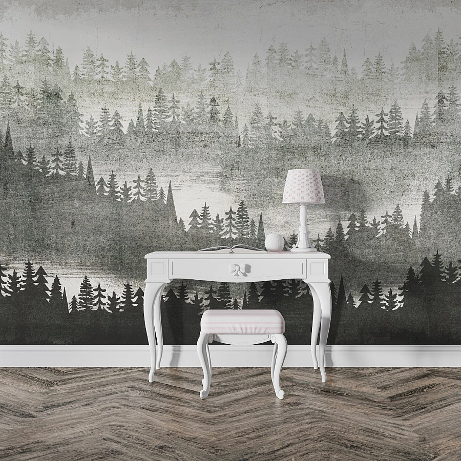 Layered silhouettes of pine trees fade into soft mist in this refined forest wall mural. The monochrome palette and textured finish create a calm, artistic composition that brings depth and quiet elegance to the wall.