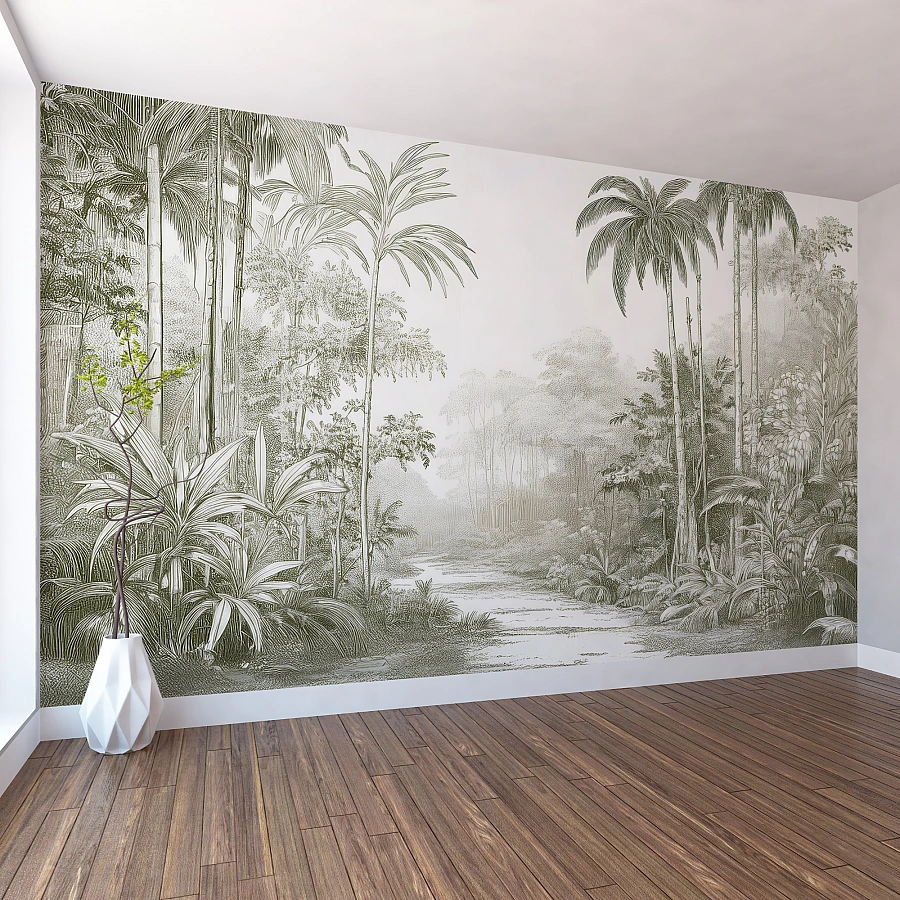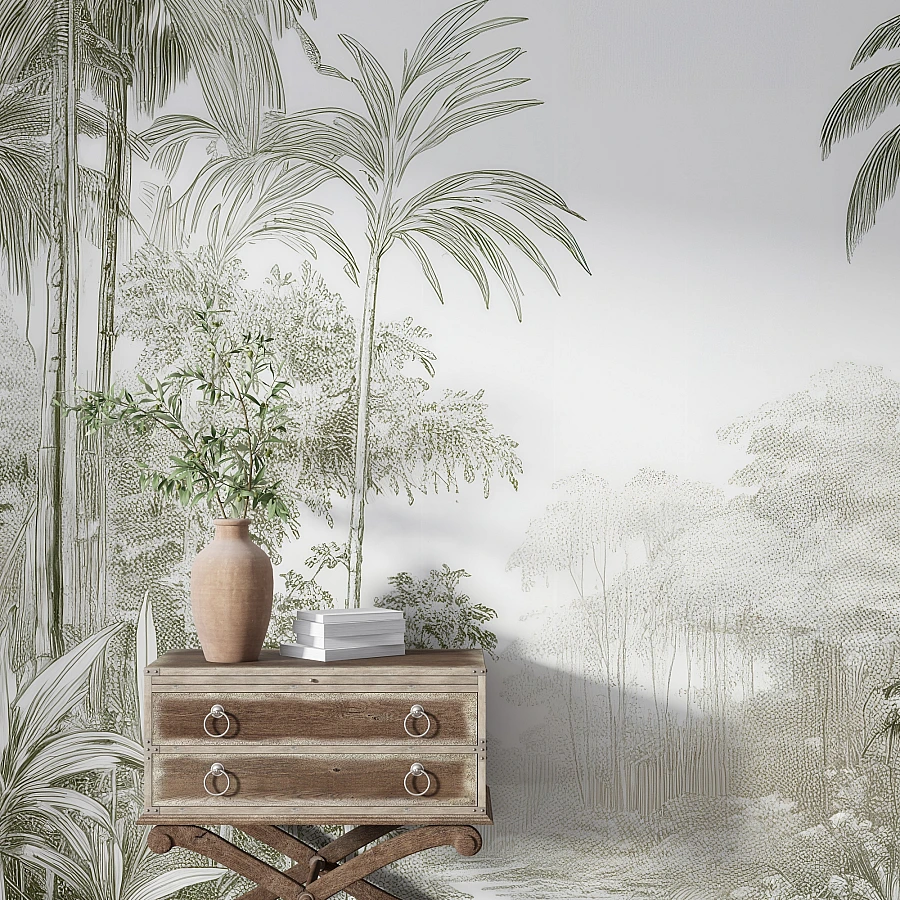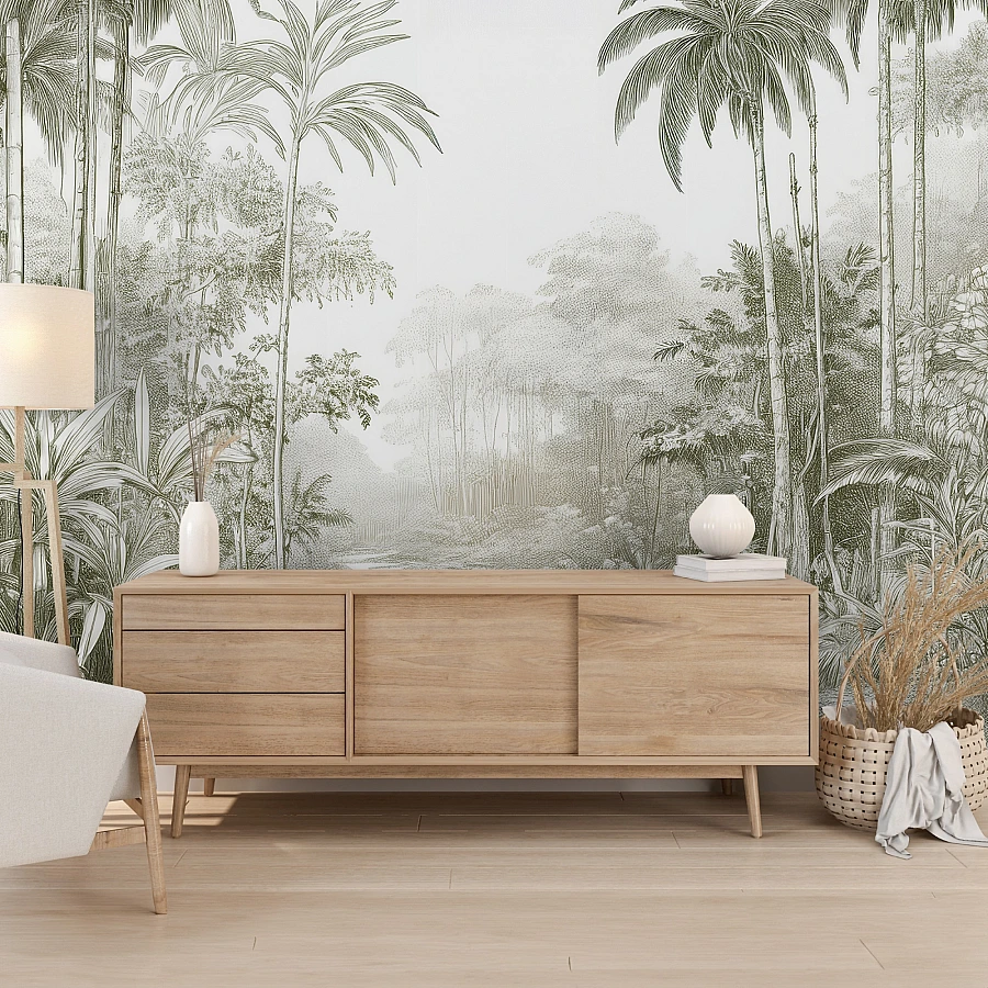 This jungle wallpaper blends subtle grey and green tones with fine sketch details, offering depth while maintaining a light and airy feel. The minimal contrast enhances elegance without overwhelming the space.