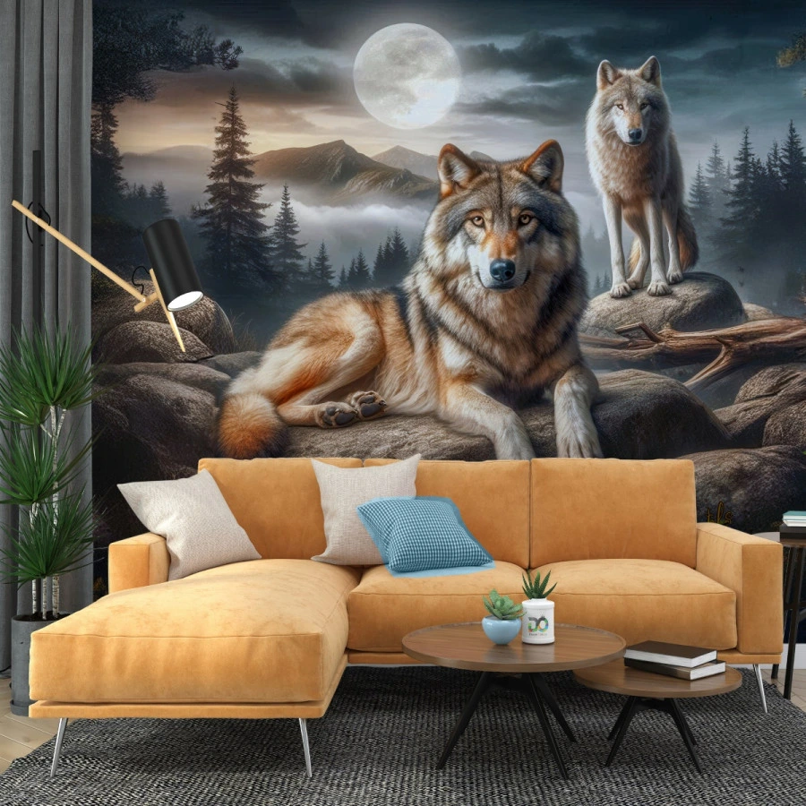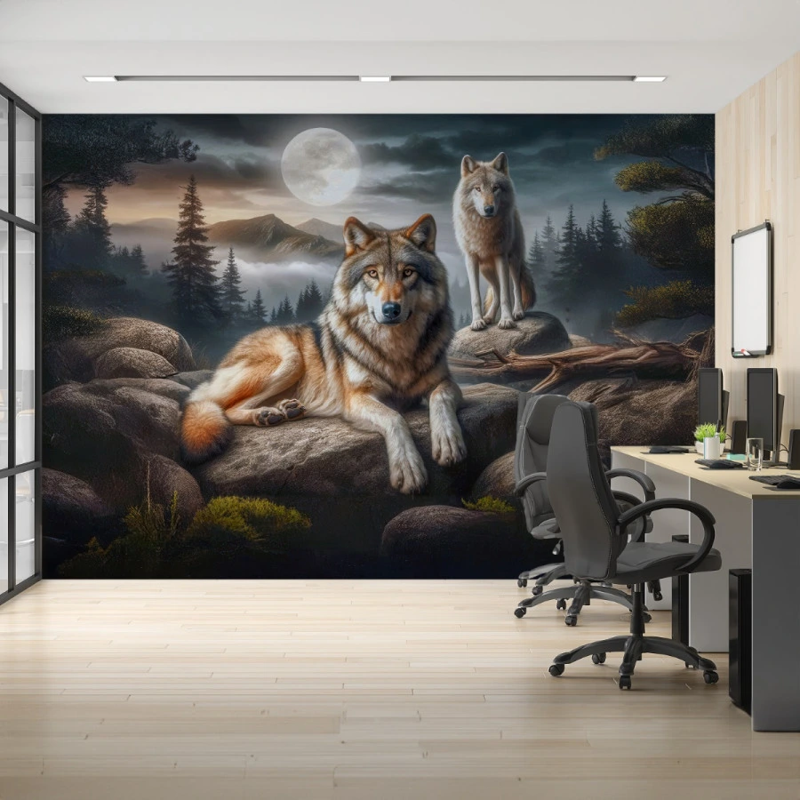 Two majestic wolves rest beneath a glowing full moon in this captivating nature wall mural. The serene yet powerful scene captures the quiet strength of wildlife in a moonlit forest.