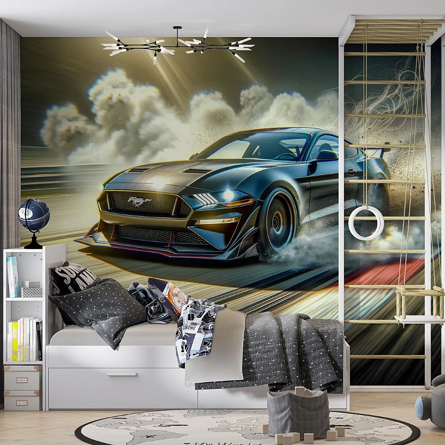 Perfect for automotive enthusiasts and bold interiors, this mural transforms the wall into a high-speed action scene. It brings power, excitement, and a strong modern character into bedrooms, gaming rooms, and creative spaces.