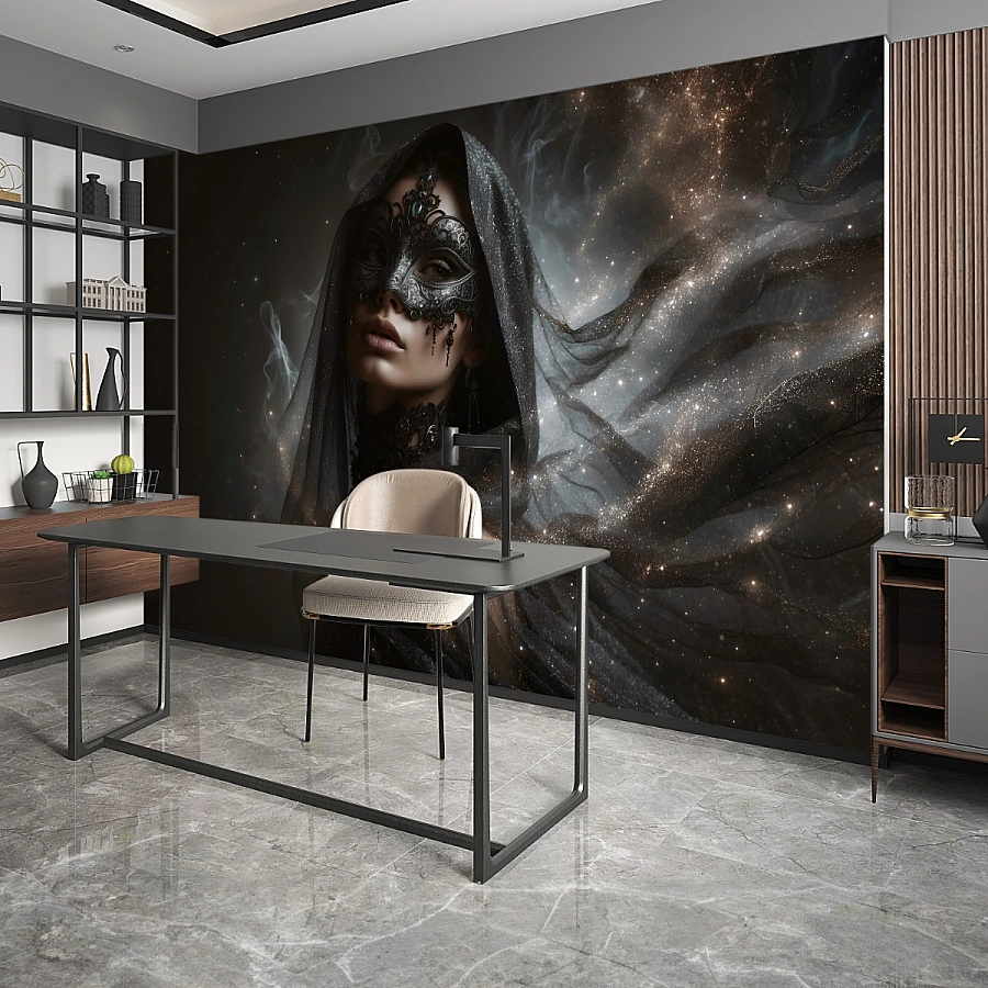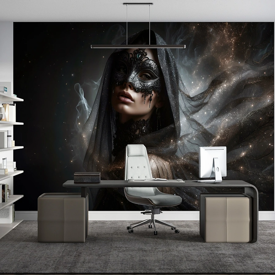 This dark portrait wallpaper blends deep black tones with subtle light effects and fine ornamental details. The intricate mask and soft textures add depth and sophistication, transforming the wall into a striking artistic statement.