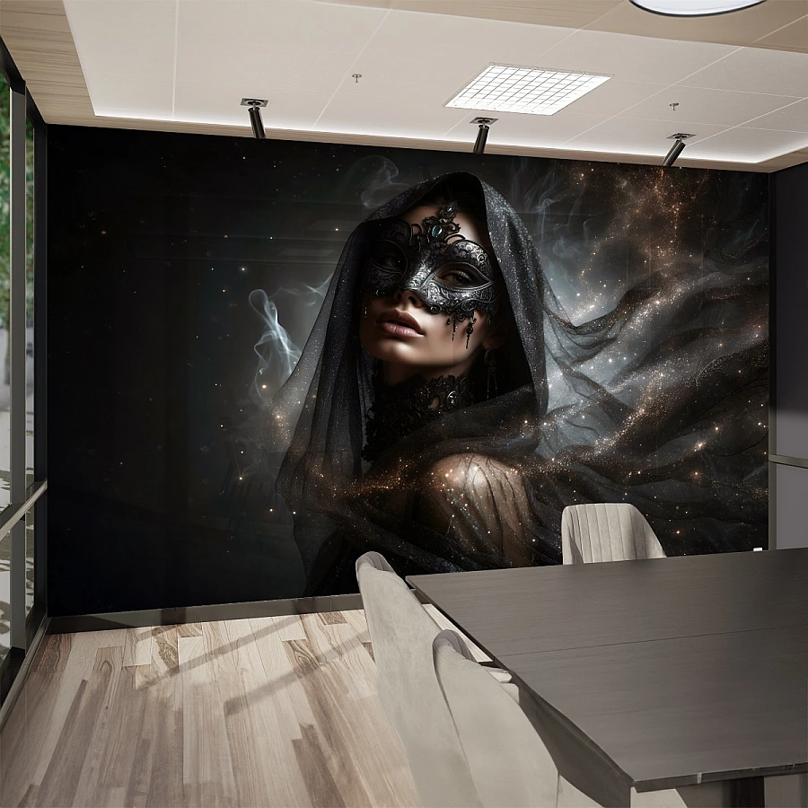 A mysterious figure emerges from shadows in this captivating portrait wall mural, where a masked woman is enveloped in flowing dark fabric and soft glowing mist. The composition creates an atmosphere of intrigue, elegance, and quiet power.