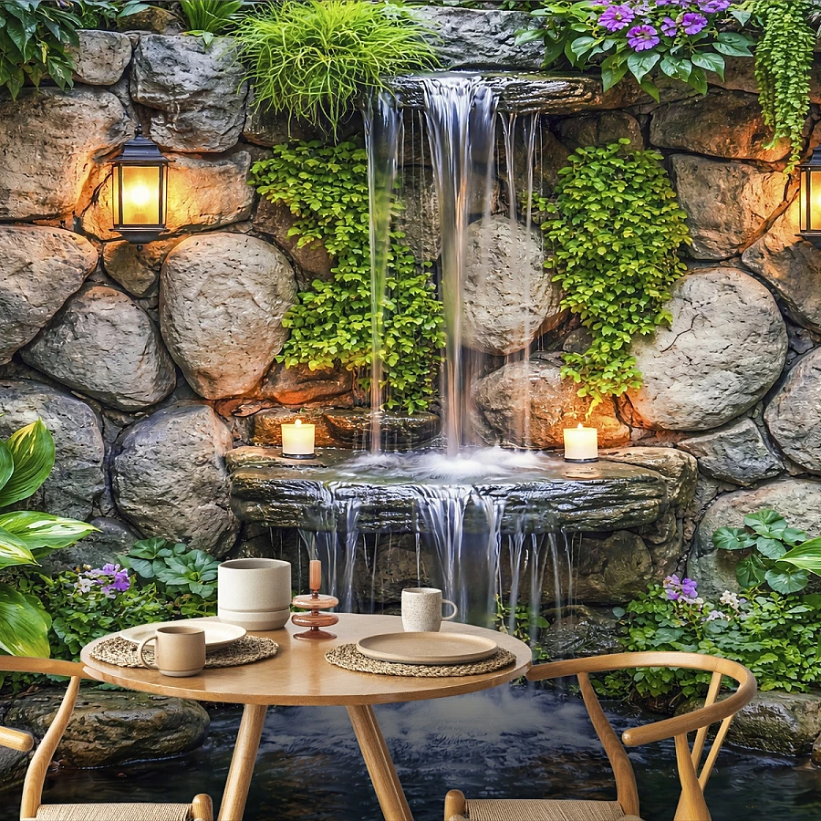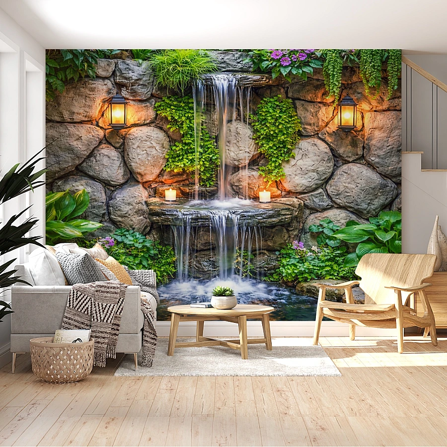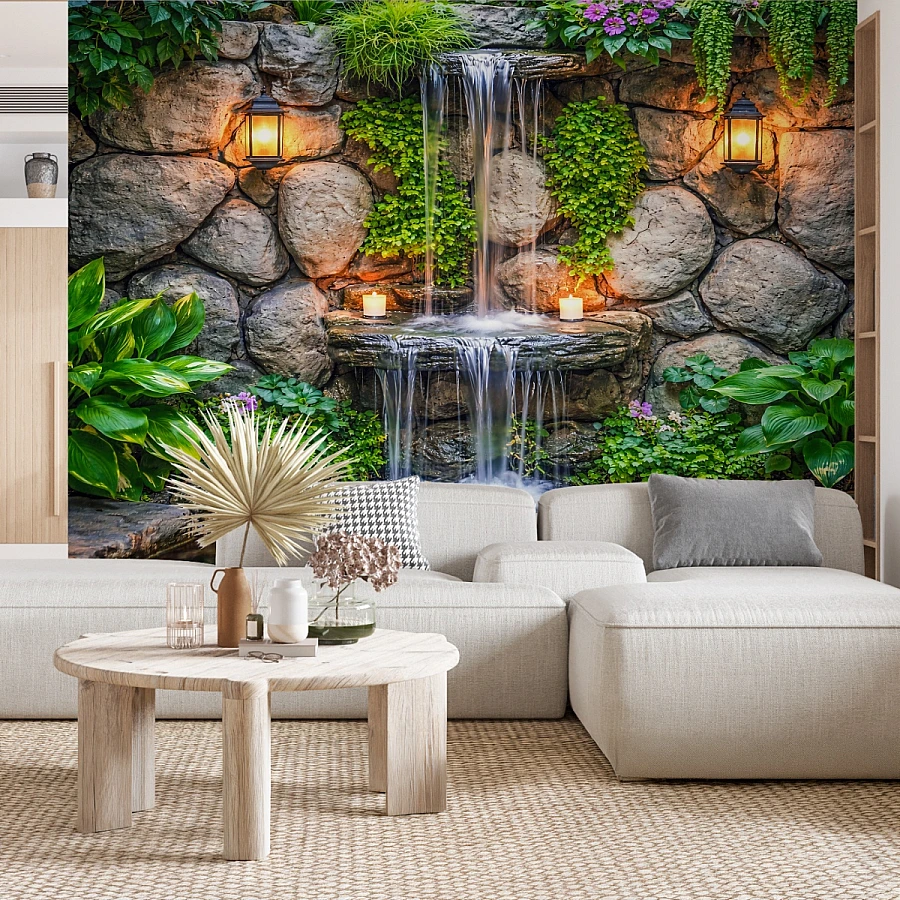 This stone waterfall wall mural brings the soothing essence of nature indoors, combining textured rock surfaces, cascading water, and lush greenery into a serene visual experience. The natural stone backdrop, enhanced by warm lantern lighting and soft candle accents, creates a peaceful and inviting atmosphere.
