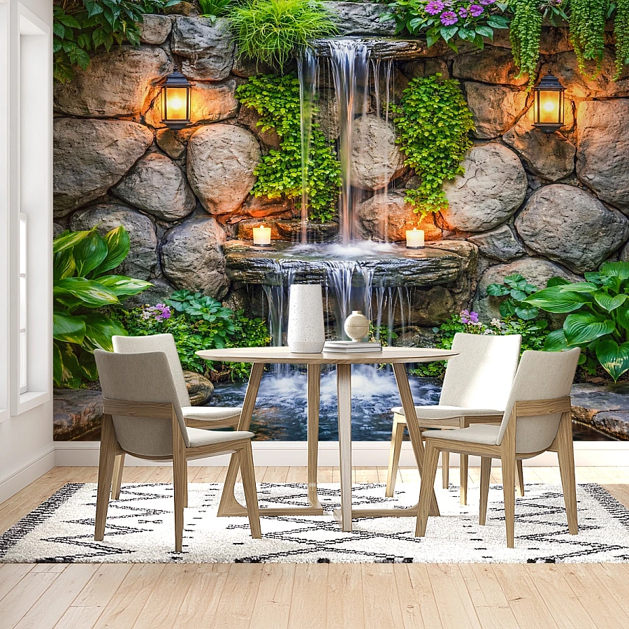 The gentle flow of water over layered stone elements adds movement and depth, while vibrant green plants introduce freshness and balance. This nature waterfall mural transforms your wall into a calming retreat, ideal for creating a spa-like ambiance in your living space.