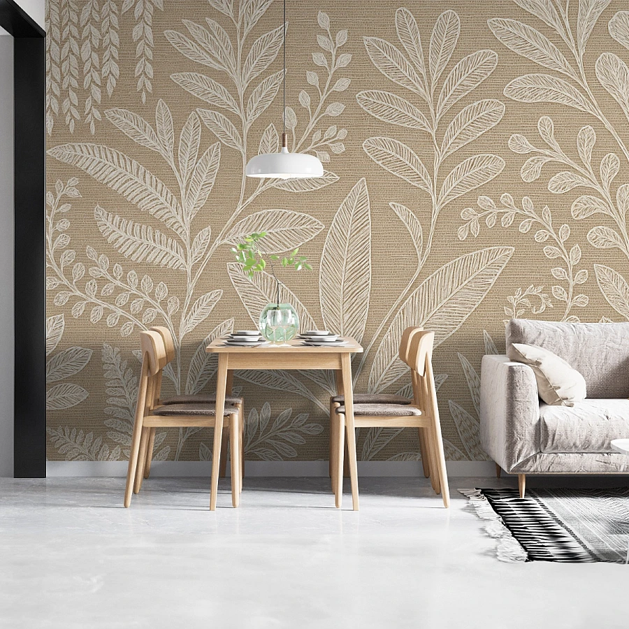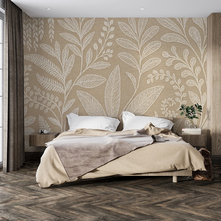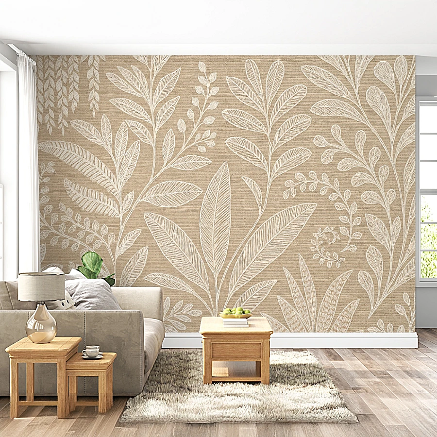 Soft botanical forms unfold across a textured beige backdrop in this elegant botanical wall mural, creating a calm and naturally refined visual effect. The delicate leaf outlines and linen-inspired surface bring warmth, balance, and understated character to the wall.