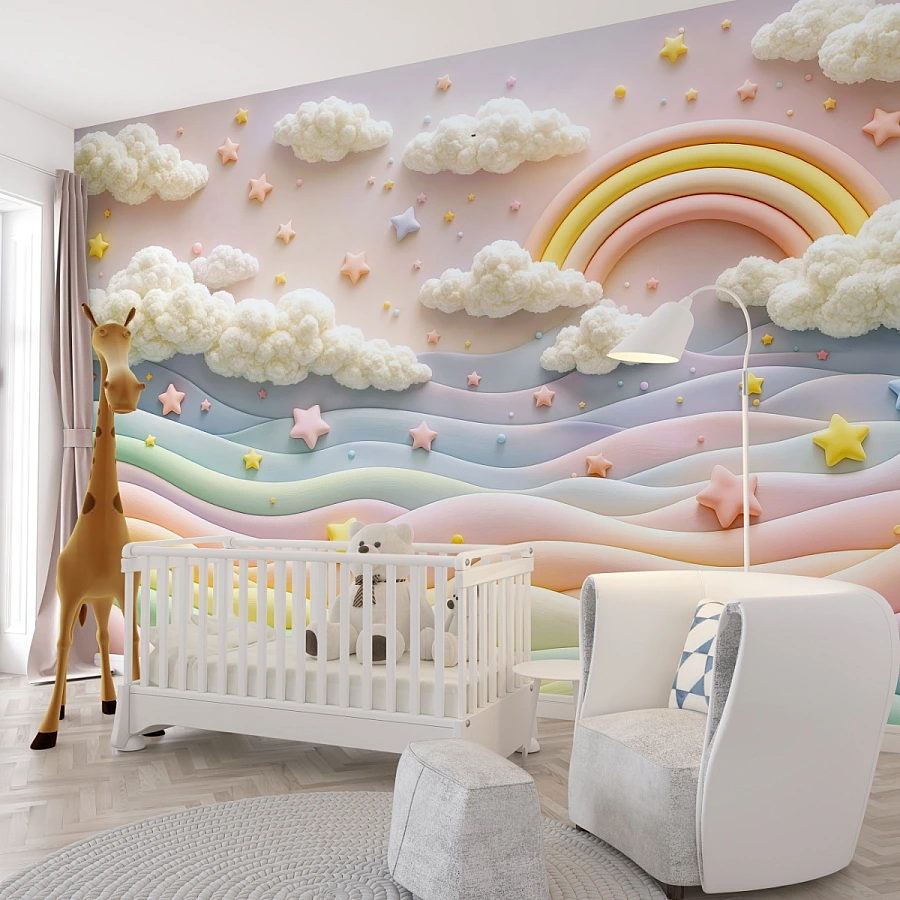 Create a magical and soothing atmosphere with this pastel rainbow nursery wall mural. Soft, flowing rainbow waves blend seamlessly with fluffy clouds and delicate stars, forming a dreamy sky that feels both playful and calming.