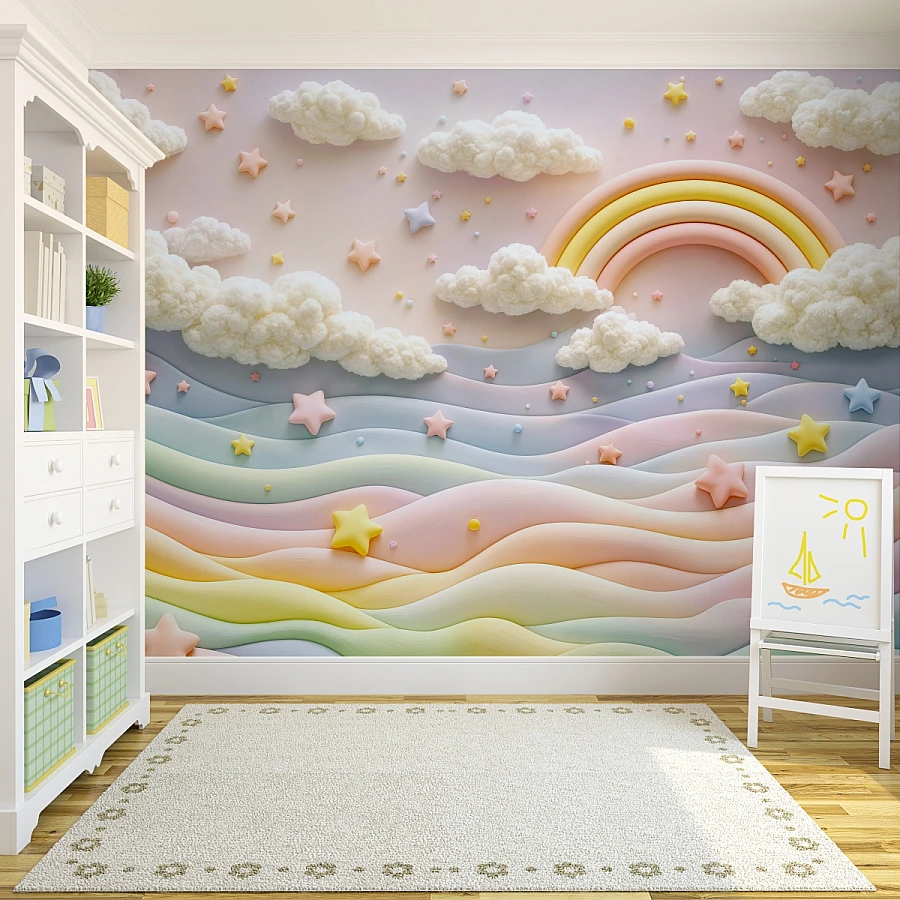 Tags: rainbow wall mural, nursery wallpaper, pastel wall decor, kids room mural, cloud wallpaper, baby room decor