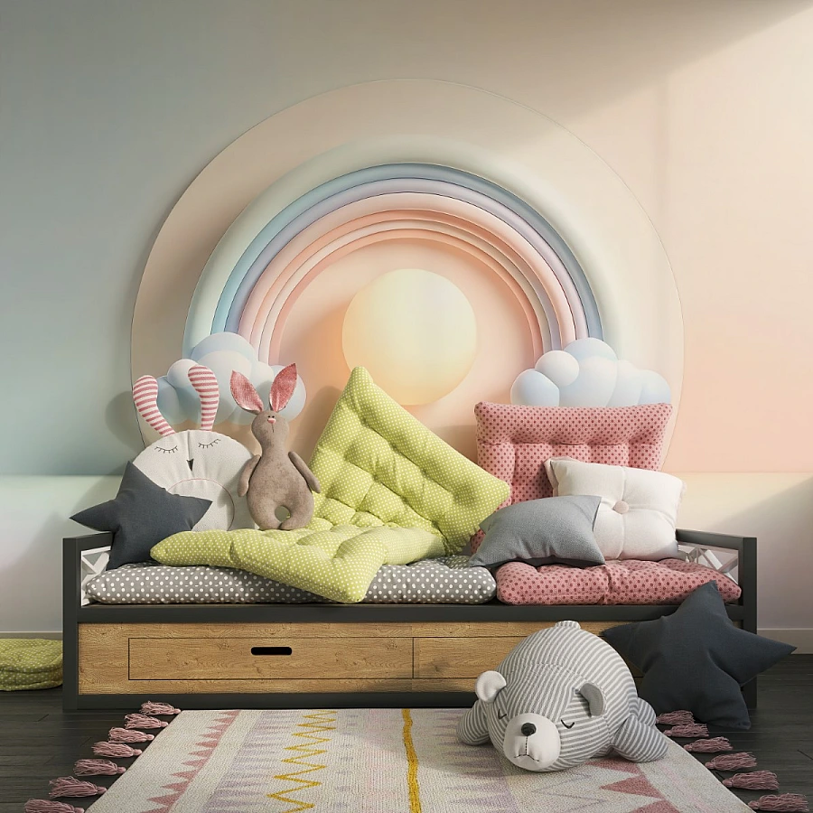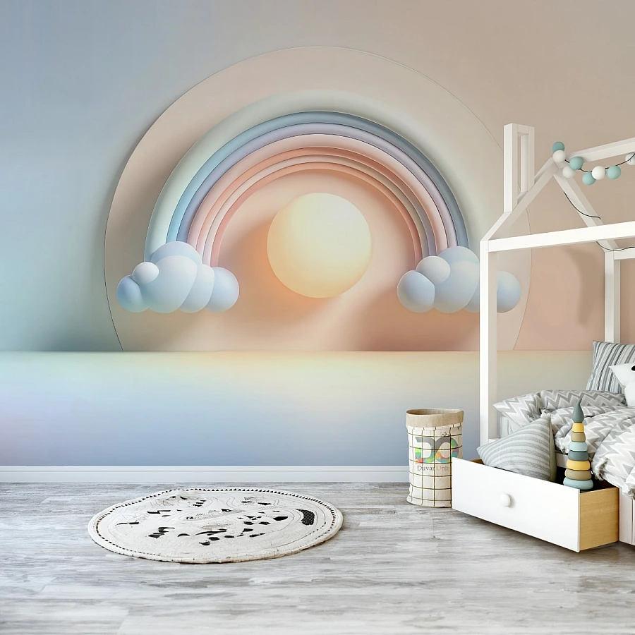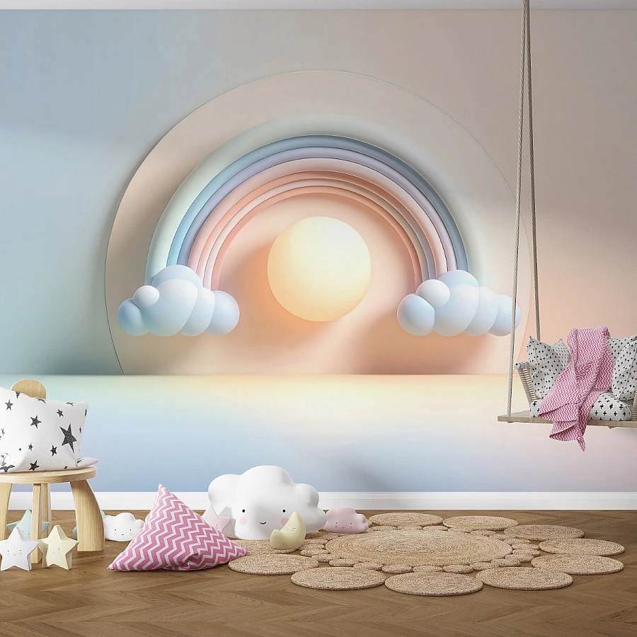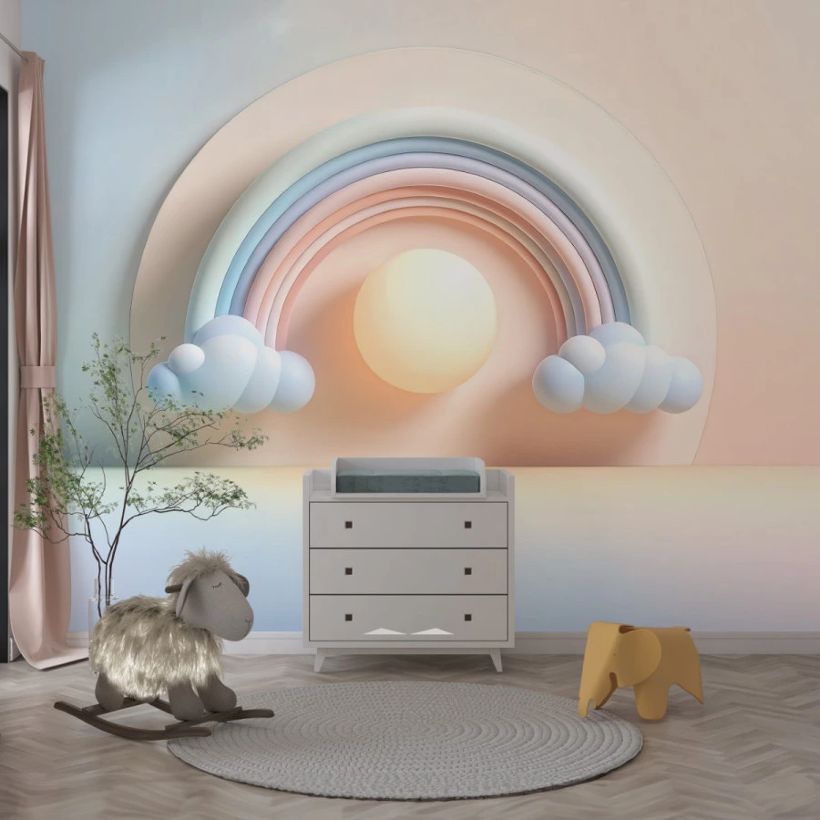 Pastel Rainbow Sun Wall Mural – Soft 3D Nursery Sky Design