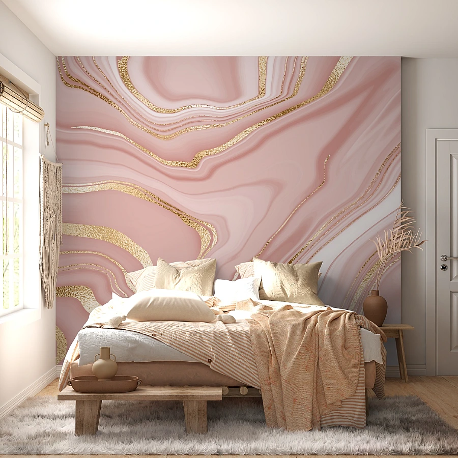 This pink marble wallpaper blends warm blush tones with creamy neutrals and shimmering gold veins. The layered effect adds depth and sophistication, making the design both modern and timeless.