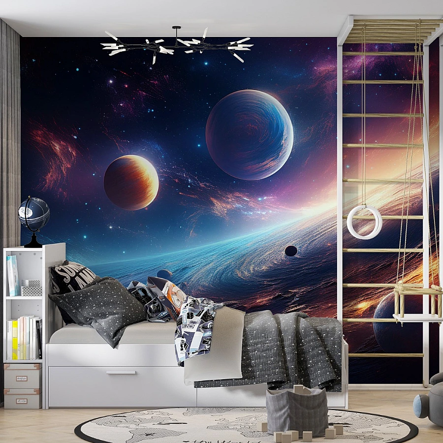 Perfect for modern and creative interiors, this mural transforms walls into a breathtaking universe. It brings a sense of wonder, exploration, and bold visual energy, making it an unforgettable centerpiece for any space.