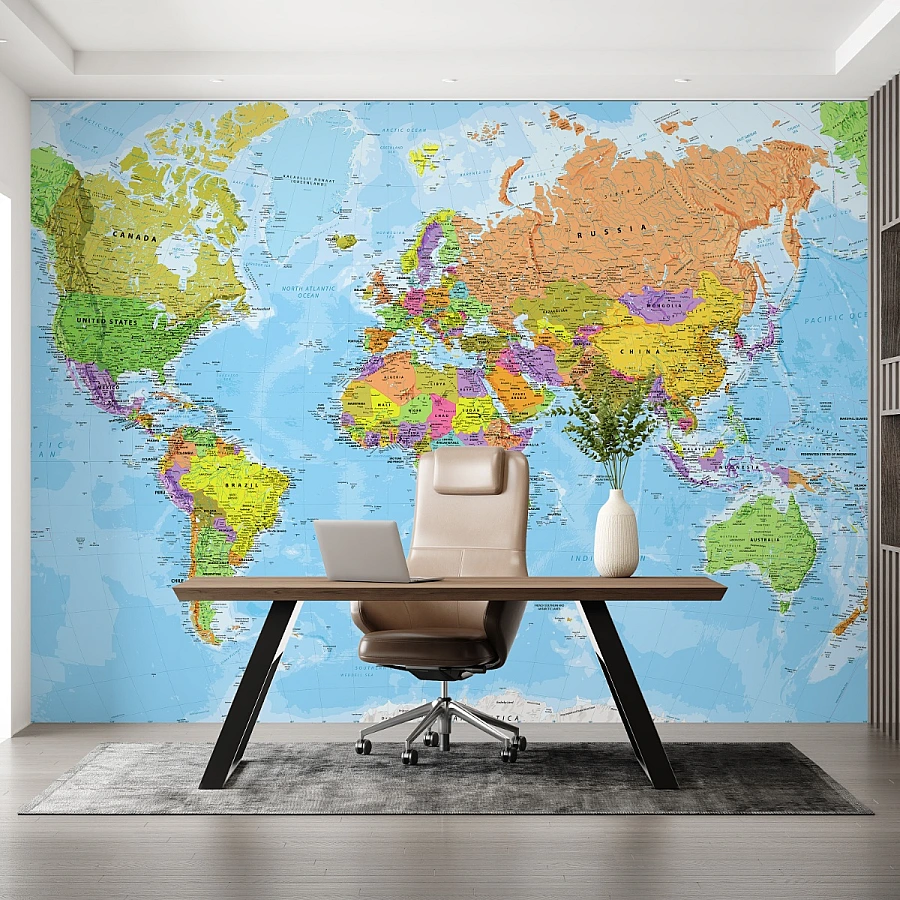 This political map wallpaper combines crisp cartographic detail with a fresh blue ocean background, creating a balanced composition that feels both professional and lively. The colorful country divisions make the mural easy to read while adding energy, clarity, and visual interest to the space.
