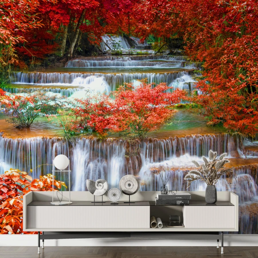 Cascading waterfalls flow through brilliant red autumn foliage in this vivid waterfall wall mural. The layered streams and colorful leaves create a powerful natural scene filled with movement, freshness, and seasonal beauty.