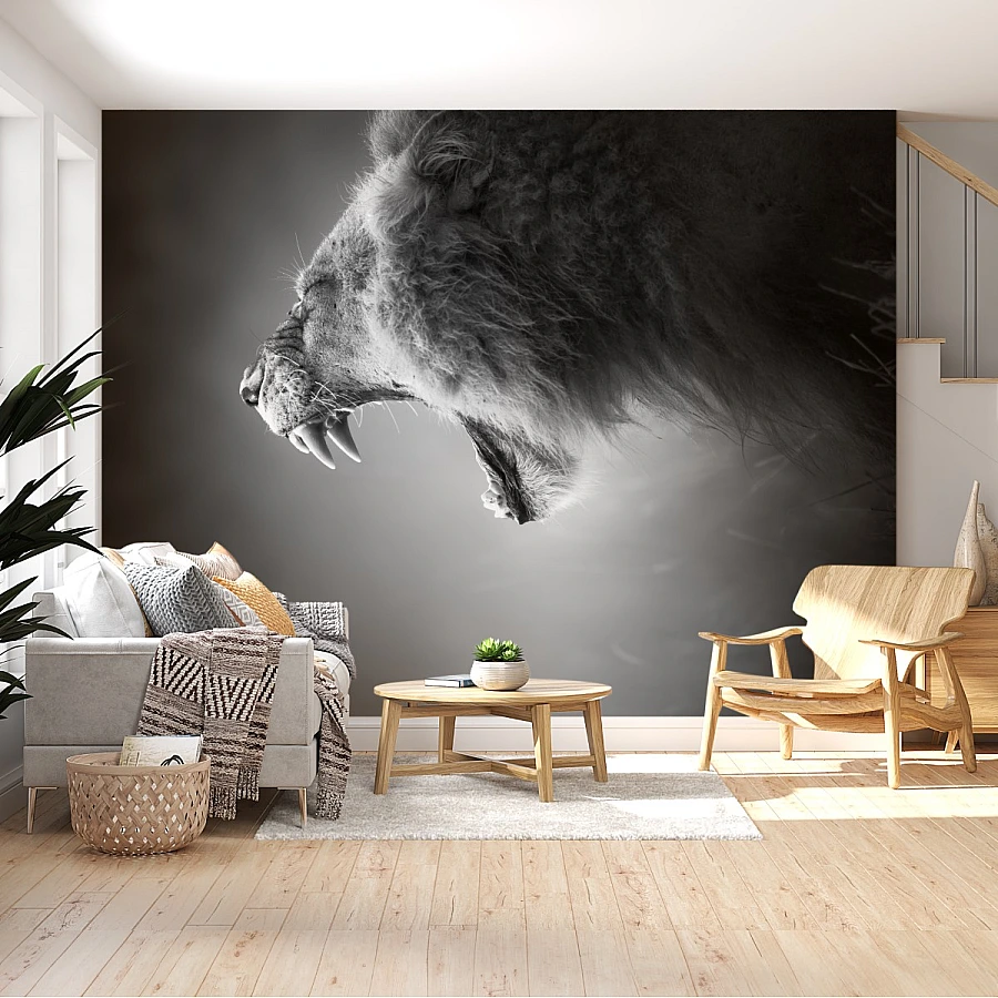 A dramatic close-up of a roaring lion dominates this powerful lion wall mural, captured in striking black and white tones. The intense expression, detailed mane, and sharp contrast create an unforgettable statement that fills the space with strength, tension, and commanding presence.