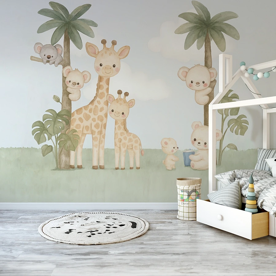 Gentle safari animals come together in a soft and heartwarming scene in this adorable safari animal wall mural. Friendly giraffes and cuddly koalas gather among palm trees and clouds, creating a peaceful and playful jungle-inspired setting.