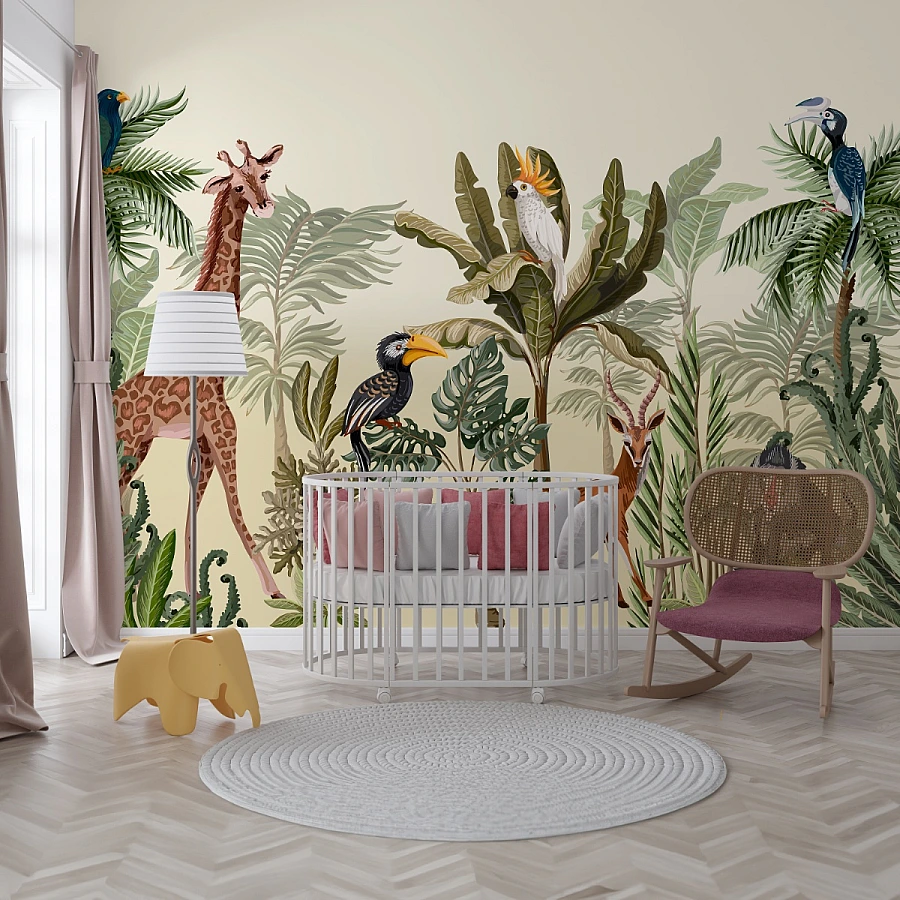 A playful safari scene comes to life with a giraffe, tropical birds, and jungle animals in this charming kids wall mural. Surrounded by lush greenery, the design sparks imagination and curiosity.