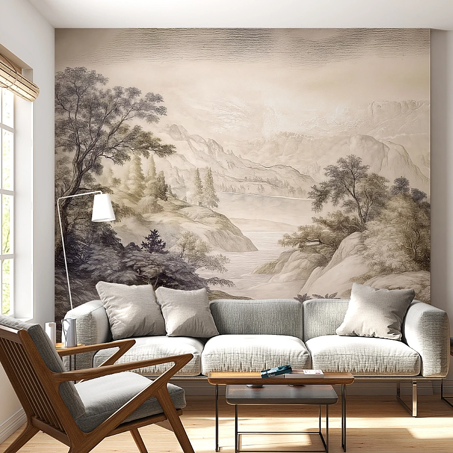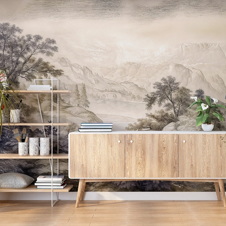 A serene mountain landscape unfolds in soft sepia tones in this refined nature wall mural, where delicate trees, rolling hills, and calm waters create a harmonious and timeless scene. The hand-drawn sketch style adds an artistic depth that feels both classic and soothing.