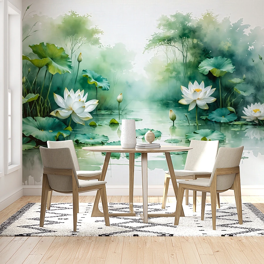 Bring a sense of calm and natural harmony into your space with this serene lotus pond wall mural. Featuring delicate white lotus flowers floating gracefully on a misty green water surface, this design captures the peaceful beauty of a quiet garden at dawn.