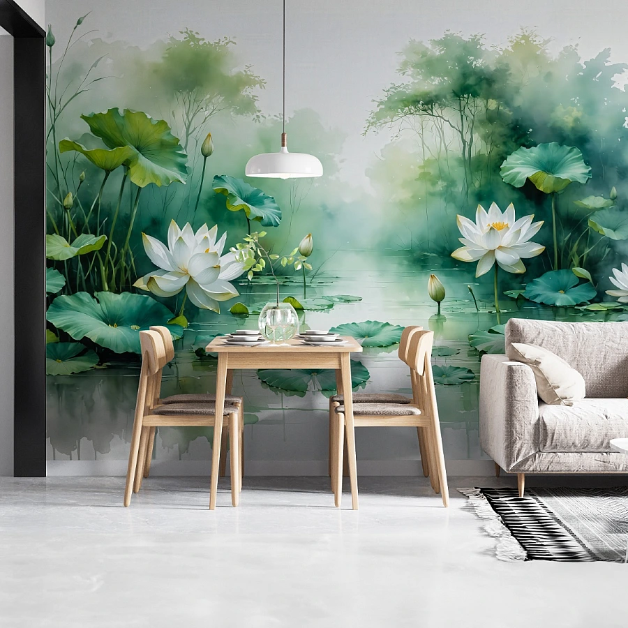 Soft watercolor transitions blend lush greenery with gentle reflections, creating a soothing depth that visually expands the room. The elegant lotus blossoms symbolize purity and tranquility, making this mural not only decorative but emotionally calming.