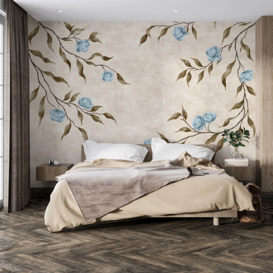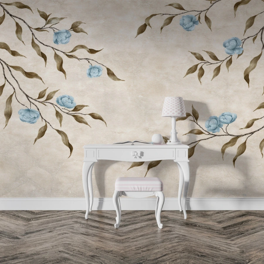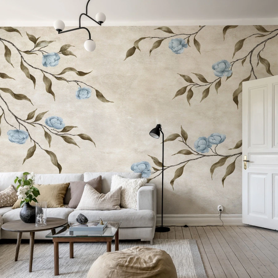 This floral branch wallpaper blends warm beige tones with gentle blue accents, offering a harmonious and minimalist aesthetic. The subtle textures enhance depth while maintaining a soft and elegant presence.