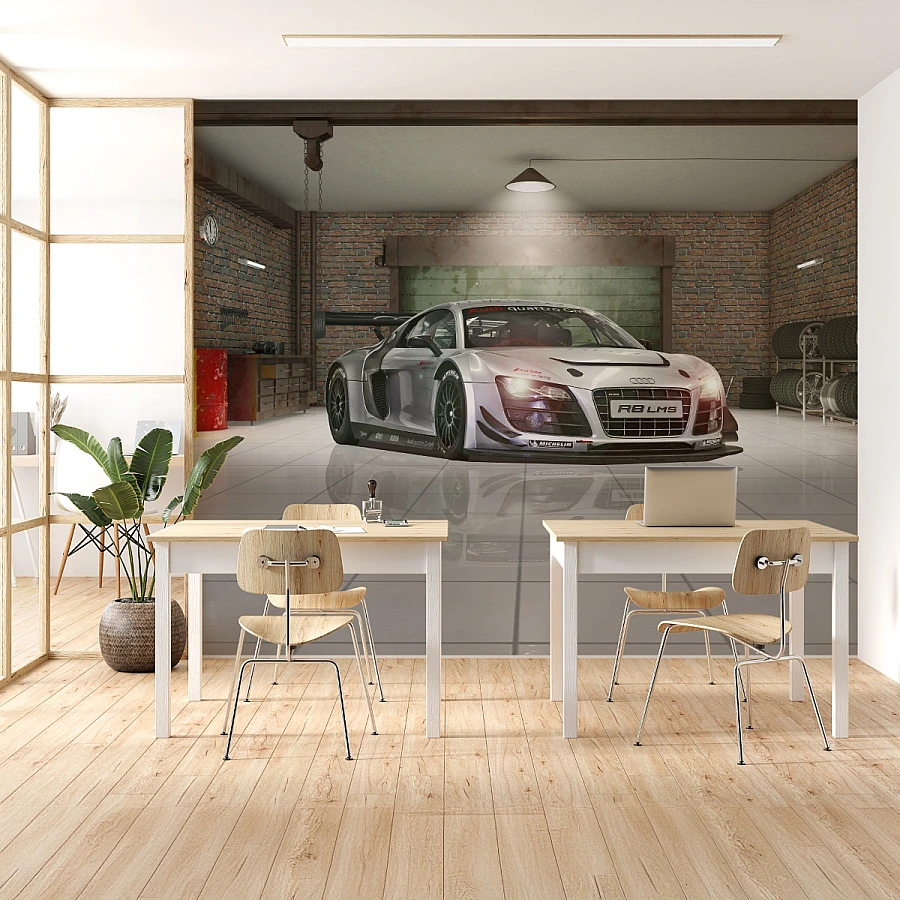 This sports car wallpaper blends precision, speed, and modern design with a refined interior setting. The perspective and lighting enhance depth, making the space appear larger while adding a bold and dynamic focal point to the room.