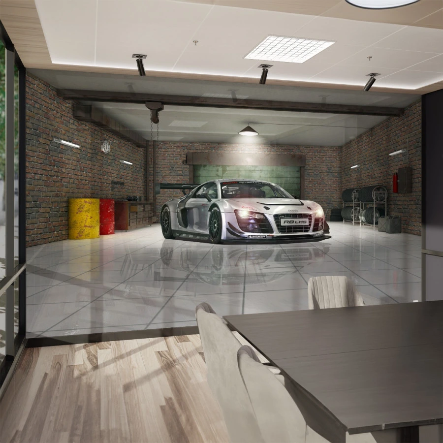 A sleek high-performance car stands at the center of a modern garage in this striking car wall mural. The clean reflections on the polished floor and the industrial brick surroundings create a powerful automotive atmosphere that feels both realistic and immersive.