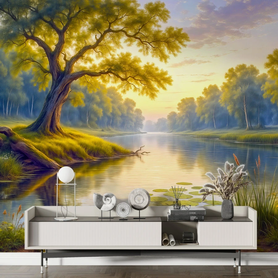 Golden sunlight filters through a majestic tree beside a calm river in this tranquil nature landscape wall mural. The soft reflections on the water and lush greenery create a serene atmosphere that brings warmth and depth to the space.