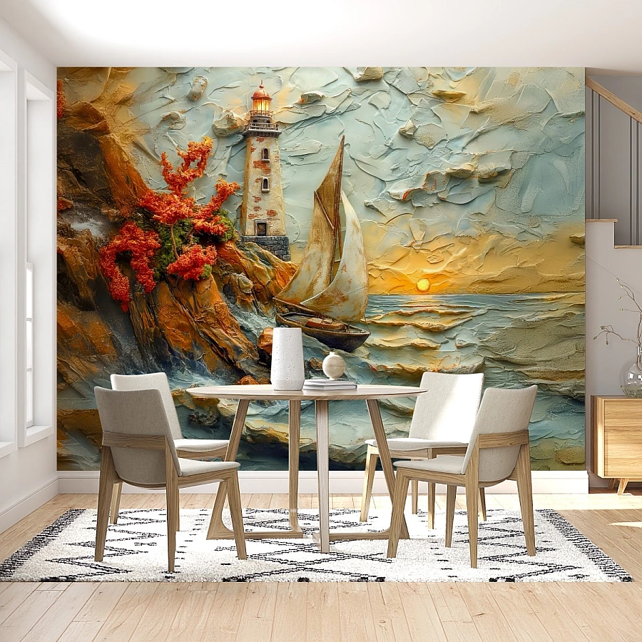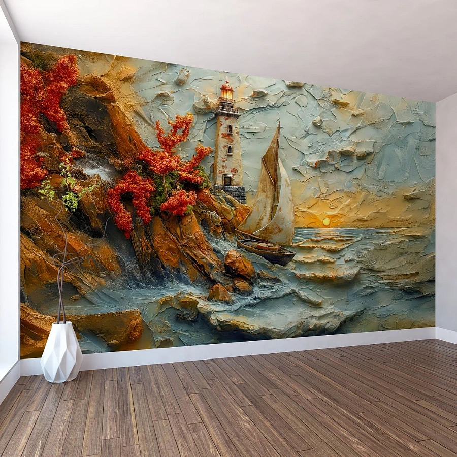 Tags: textured mural, lighthouse wallpaper, sailboat mural, coastal wall decor, sunset sea wallpaper, 3d effect wallpaper