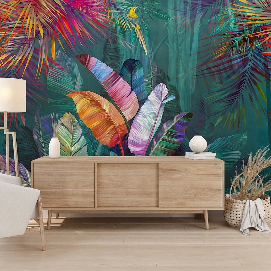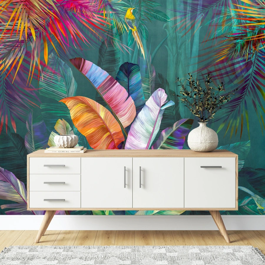 Layered palm and banana leaves in vivid shades of pink, orange, teal and purple create a lively jungle composition against a deep green backdrop. The rich colors and dynamic arrangement bring a sense of movement and tropical warmth into the room, instantly transforming any wall into a striking focal point.