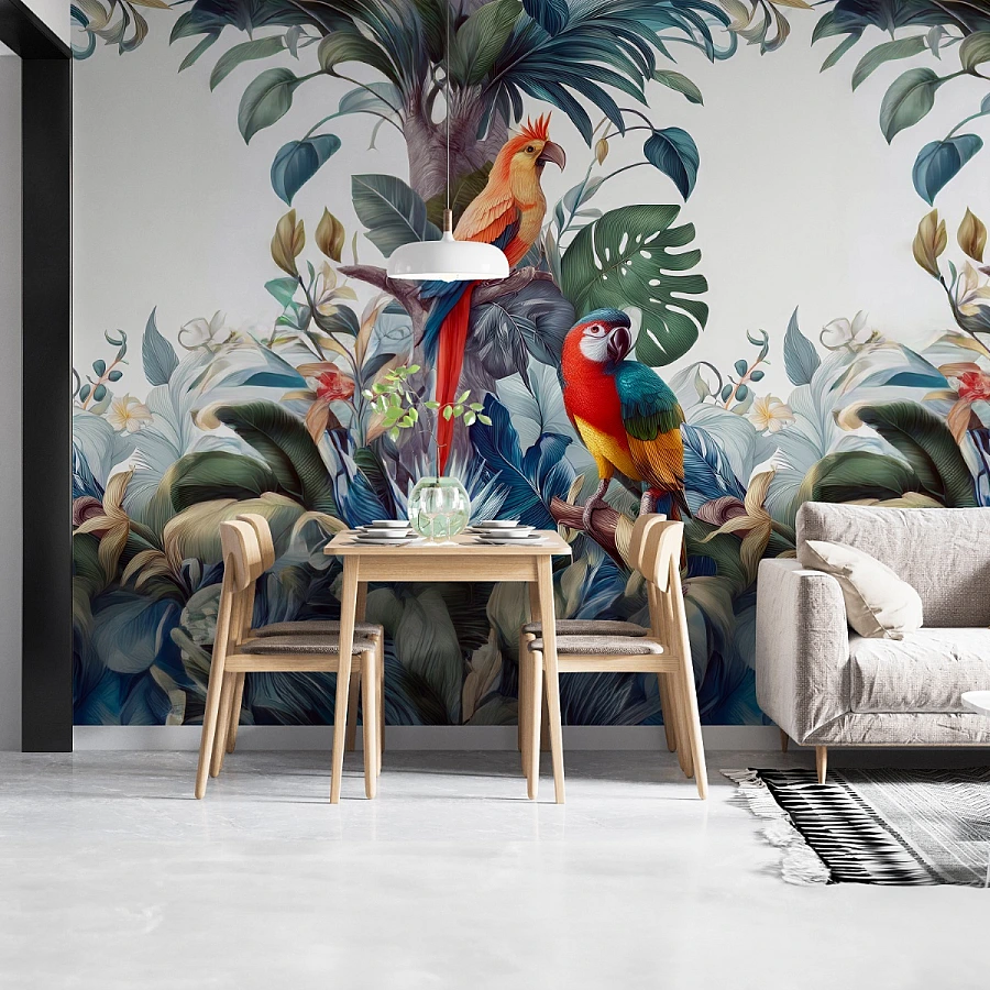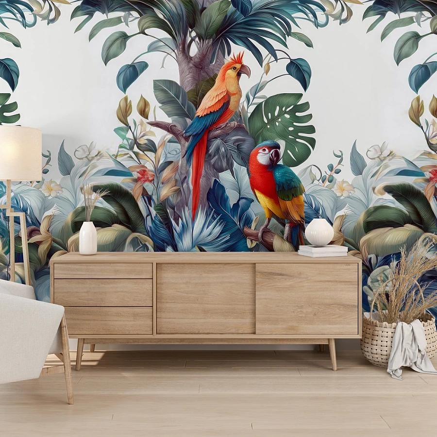 Two vibrant parrots perch among layered tropical leaves in this elegant botanical wall mural. The rich foliage and soft background create a balanced composition full of life and color.