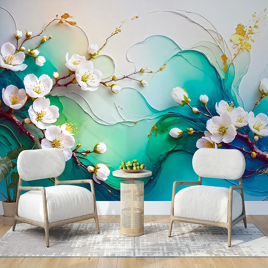 Where fluid art meets delicate nature, this turquoise marble blossom wall mural creates a breathtaking fusion of elegance and movement. Soft white flowers bloom gracefully across flowing layers of teal, emerald, and jade tones, accented with subtle golden highlights that add a refined sense of luxury.