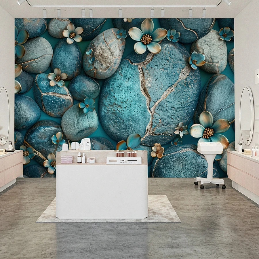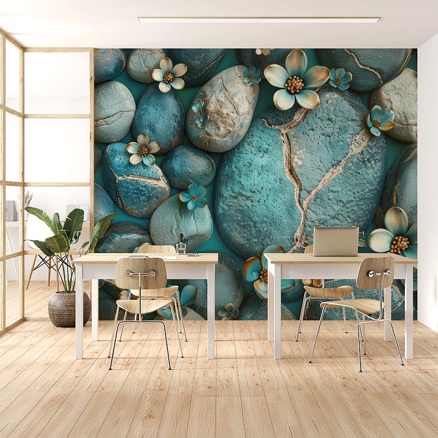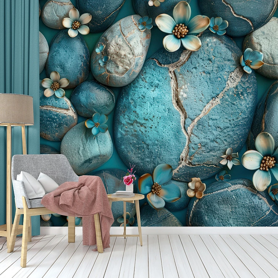 Turquoise Stone Floral Wall Mural – Luxury 3D Pebble Design