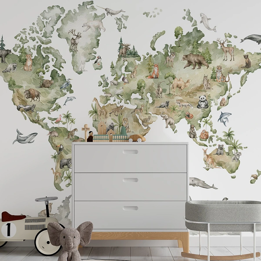 A beautifully illustrated world map filled with animals from every continent brings learning and imagination together in this charming kids wall mural. The soft watercolor style creates a calm and story-like atmosphere.