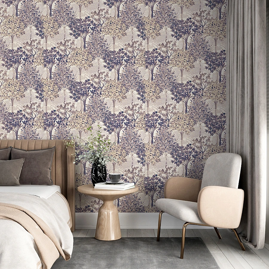 Delicate trees and intricate floral patterns repeat gracefully across the surface in this refined botanical wall mural. The vintage-inspired composition creates a soft, rhythmic elegance that feels both classic and timeless.