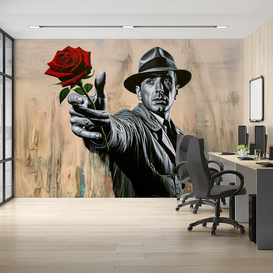 A striking black-and-white figure extends a vivid red rose in this cinematic art wall mural, blending classic noir style with bold contrast. The gesture creates an engaging and emotional focal point.
