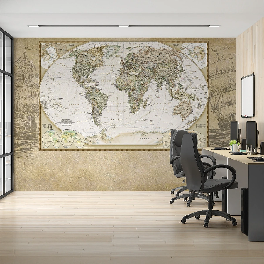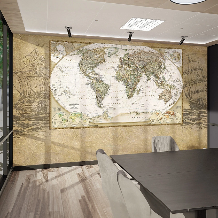 An intricately detailed antique map stretches across the wall in this timeless world map wall mural. With its aged tones and classic cartographic styling, the design brings a sense of history, exploration, and intellectual charm into the space.