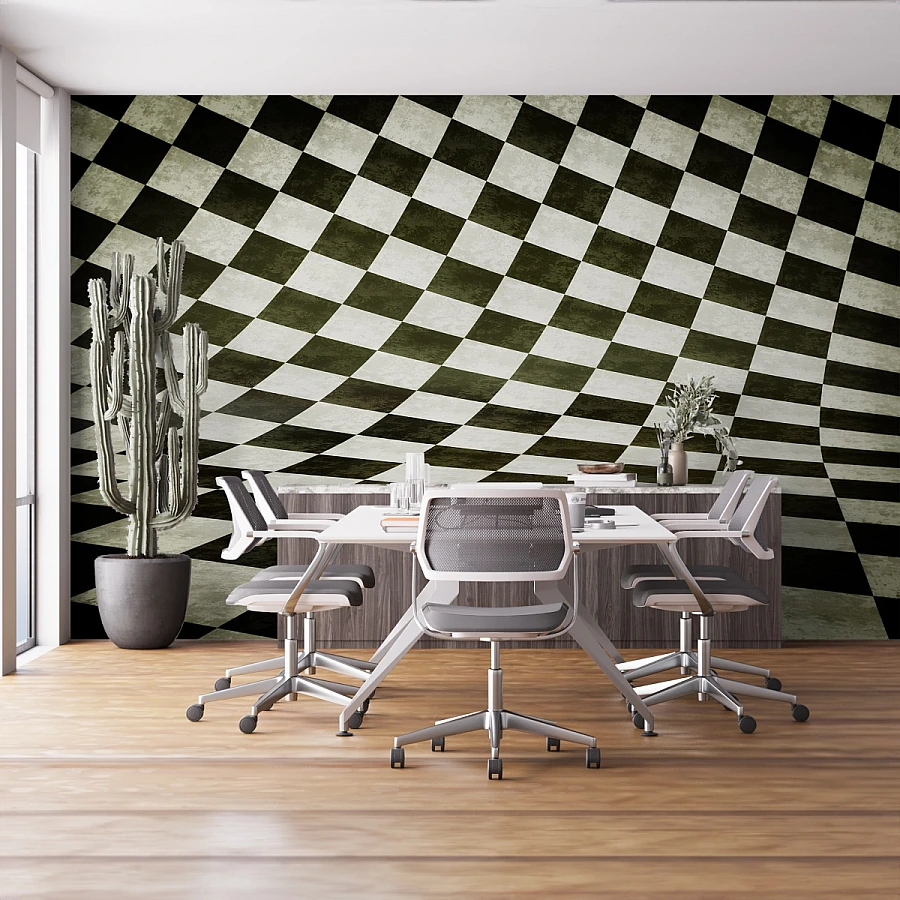 Tags: optical illusion wallpaper, checkered wall mural, geometric wallpaper, black white mural, modern wall decor, abstract illusion mural