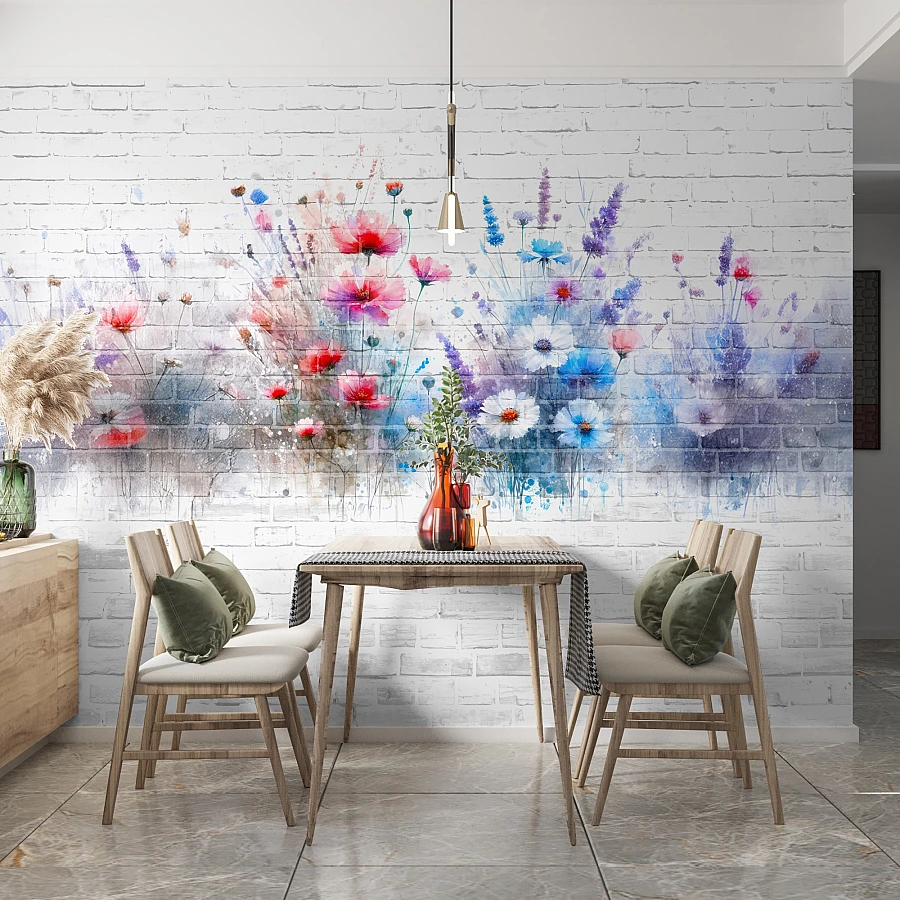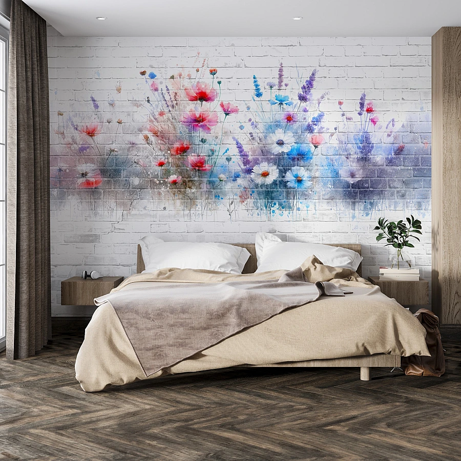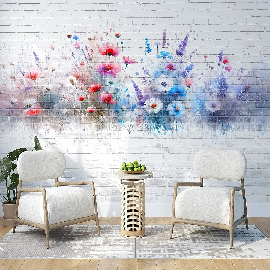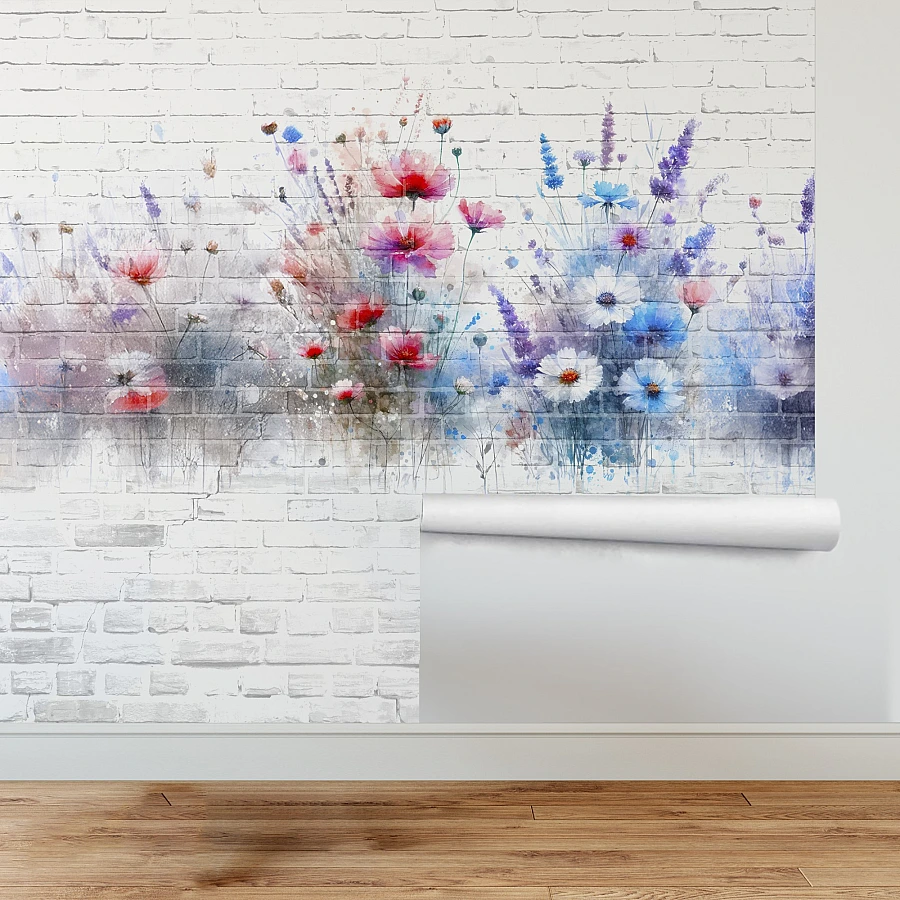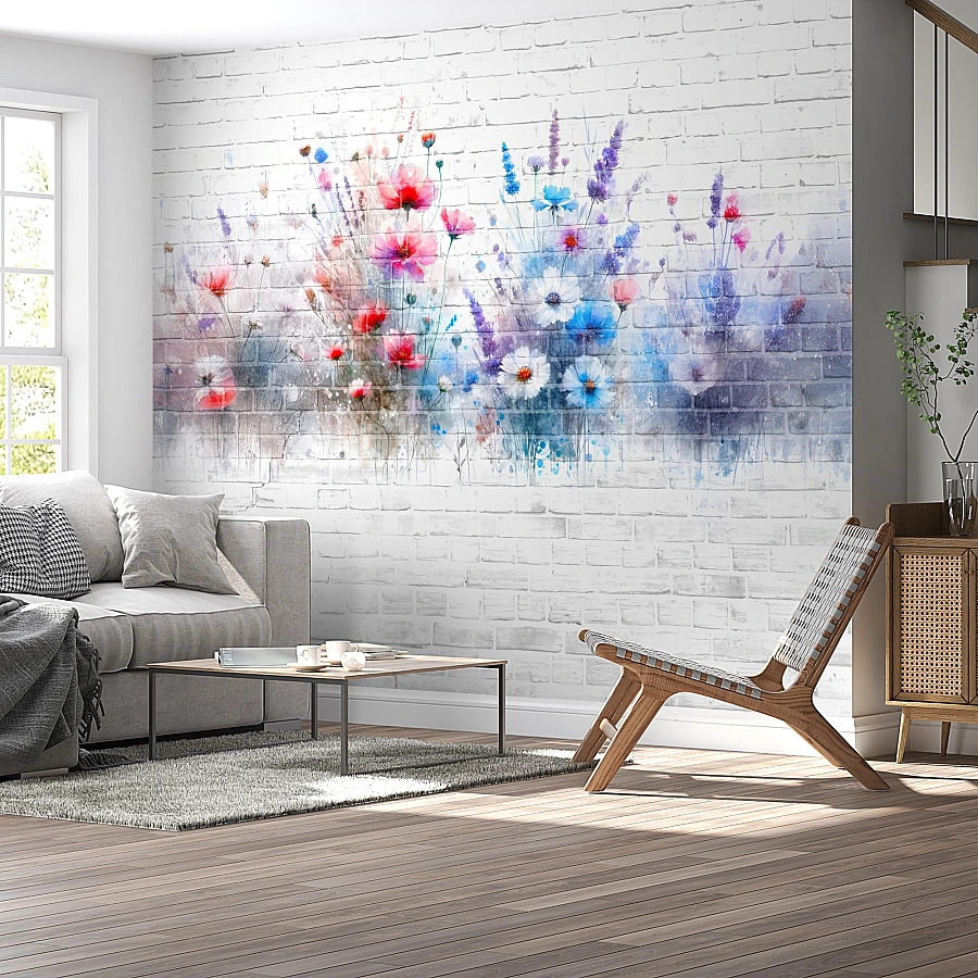 Soft watercolor flowers bloom across a white brick background in this charming floral wall mural. The colorful blossoms and delicate brush effects create a fresh, artistic composition with a light urban character.