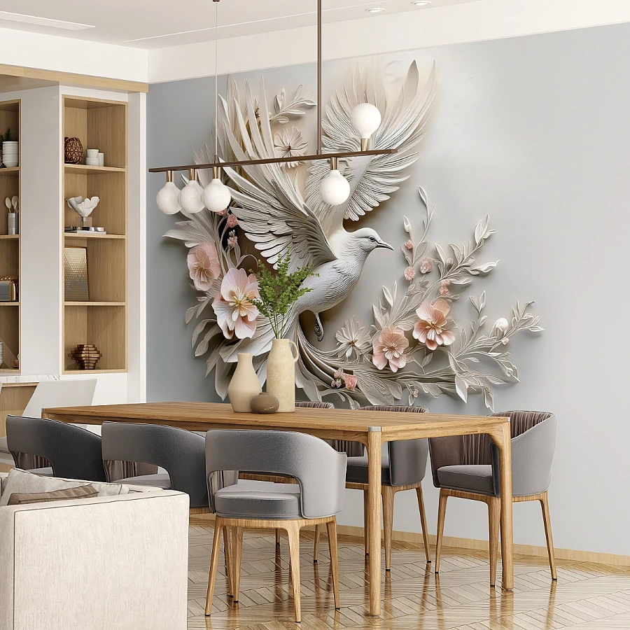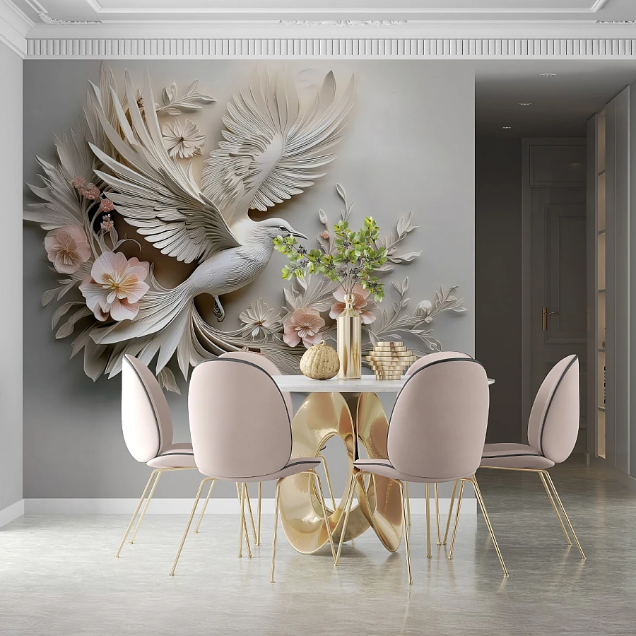 The delicate relief-style floral design gives this modern wall mural a subtle three-dimensional presence. Light interacts gently with the surface, enhancing the soft textures and adding a clean, luminous feel to the space.
